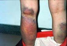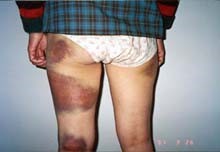 当时,别的法轮功学员和几个工作人员都看到了柳勇的伤,双腿后面由上至下遍布青紫淤伤,胸部被打得不敢咳嗽,一咳嗽就疼,持续了好多天。