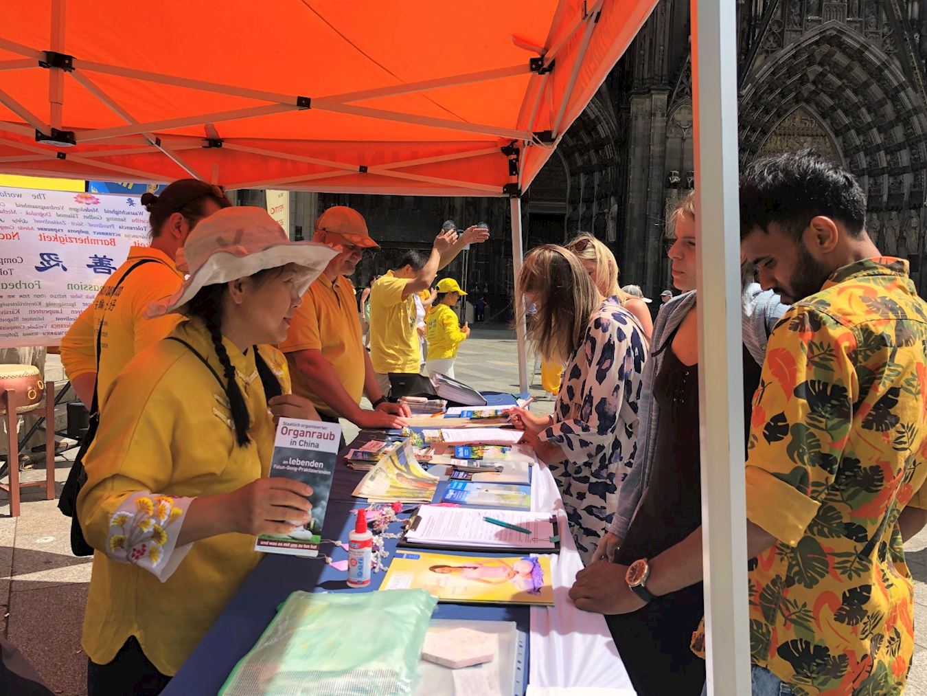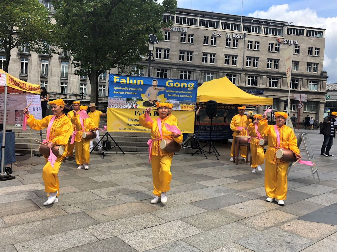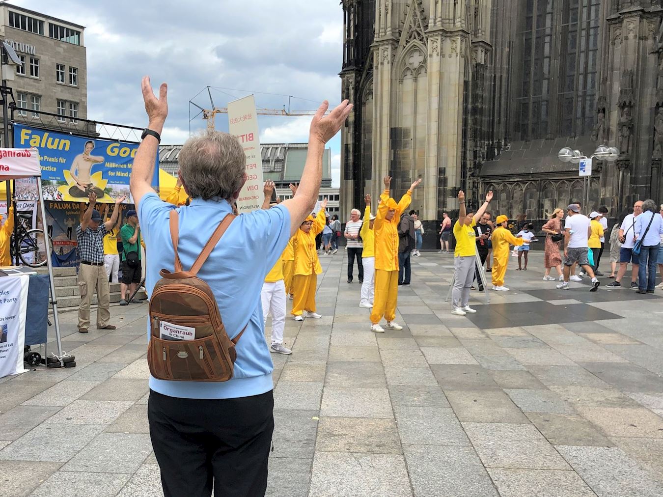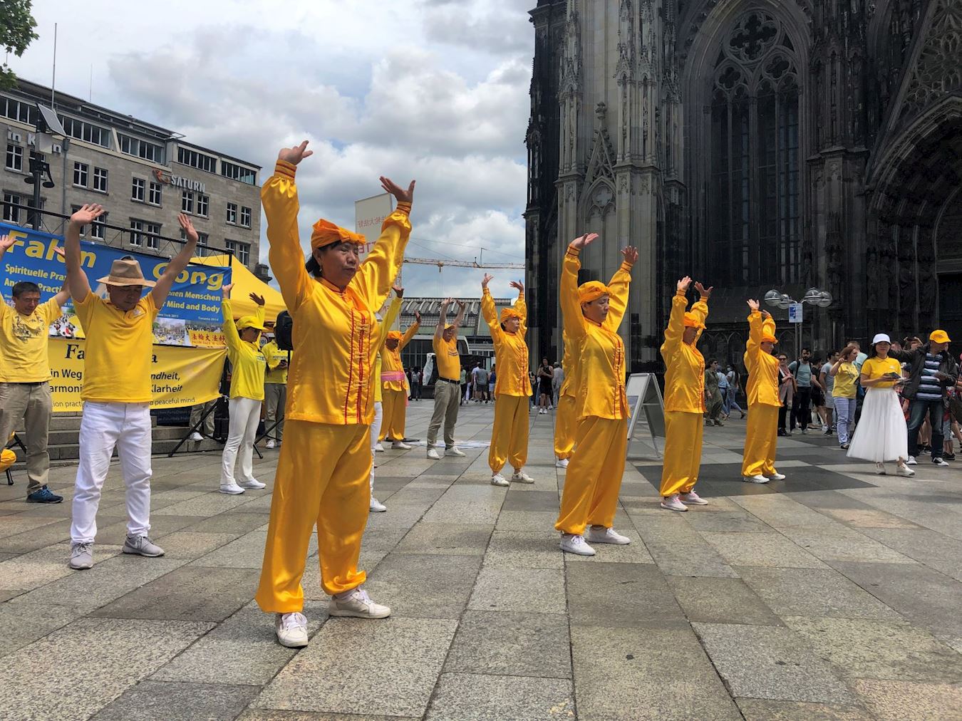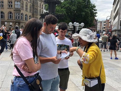 活动这天是周六,天气晴朗,活动当天科隆大教堂前的广场上聚满了来自世界各地的游客。学员们的腰鼓表演赢得了阵阵掌声,很多人被平和的功法演示吸引,主动驻足向学员们了解法轮功。
