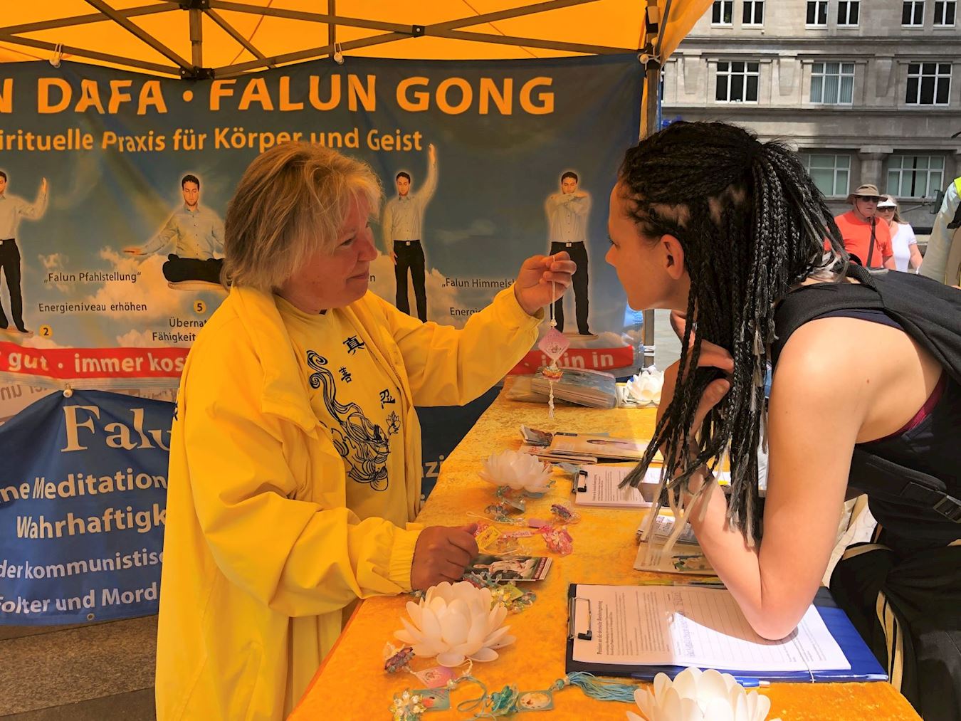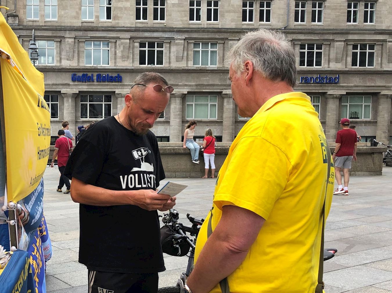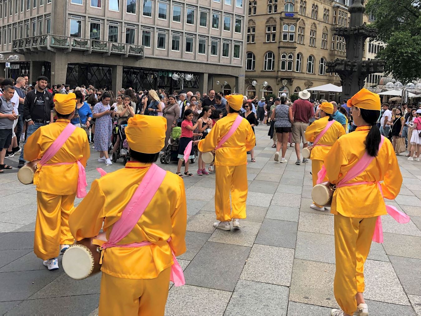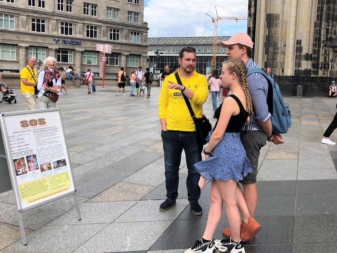 活动这天是周六,天气晴朗,活动当天科隆大教堂前的广场上聚满了来自世界各地的游客。学员们的腰鼓表演赢得了阵阵掌声,很多人被平和的功法演示吸引,主动驻足向学员们了解法轮功。