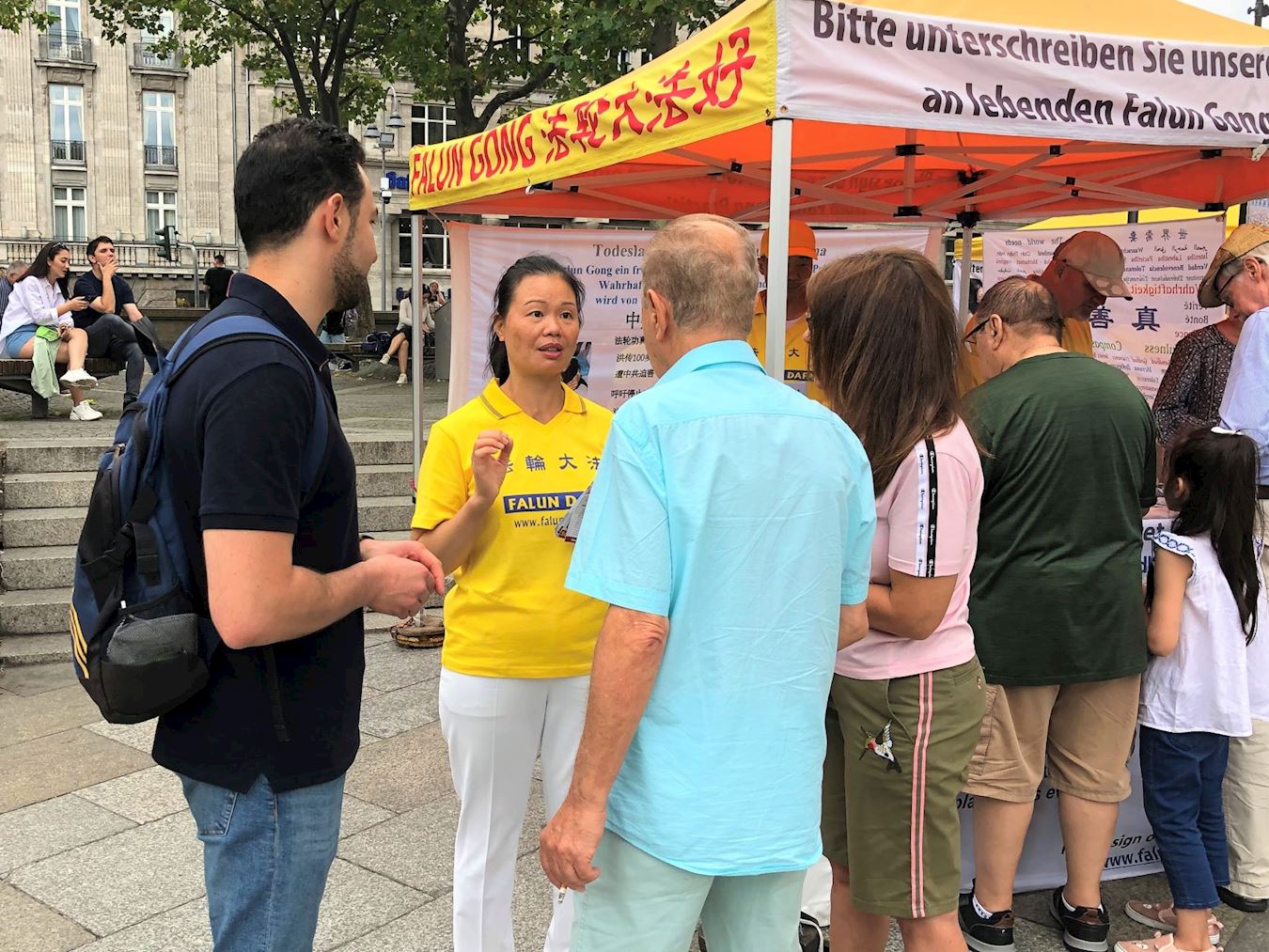 学员们演示了五套功法并表演了腰鼓。广场上熙熙攘攘,身穿金色炼功服的法轮功学员格外引人注目。来自世界各地的游客中,有不少人是第一次听说法轮功,了解到法轮功真、善、忍的准则和中共的迫害后,人们纷纷为反迫害签名。