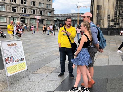 一对来自英国的年轻夫妇在科隆火车站转车,因为得等半个多小就来到大教堂参观。他们说:“我们在那边(大教堂的另一边)听到你们打鼓的声音,就过来看看。”这对夫妇都为反迫害签了名,并说:“很高兴在这里见到你们,祝你们好运。”