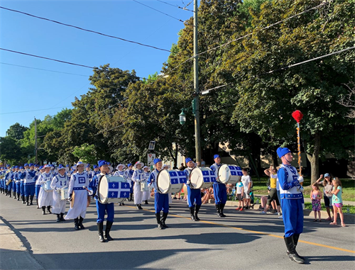 当天的游行中,阵容庞大的法轮功学员队伍受到观众的喜爱。天国乐团成员身着蓝白色服装,鼓号声雄壮有力,气势壮观;紧随其后的炼功方阵成员身着金黄色炼功服,沿途展示舒缓祥和的法轮功功法。沿途民众不断地报以掌声、欢呼声,有的跟着乐曲节奏起舞,有的学做炼功动作。