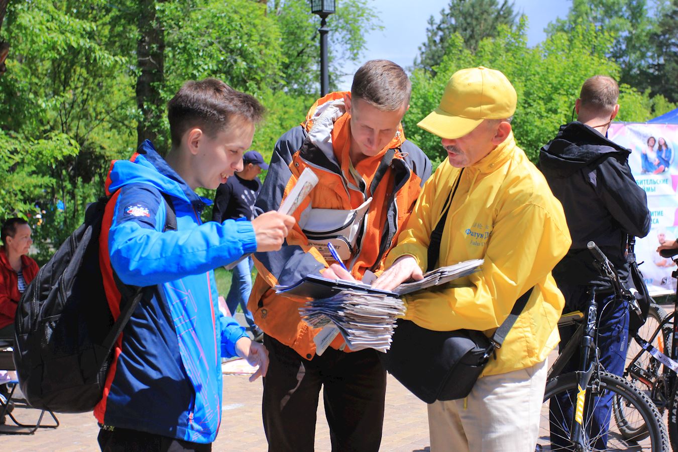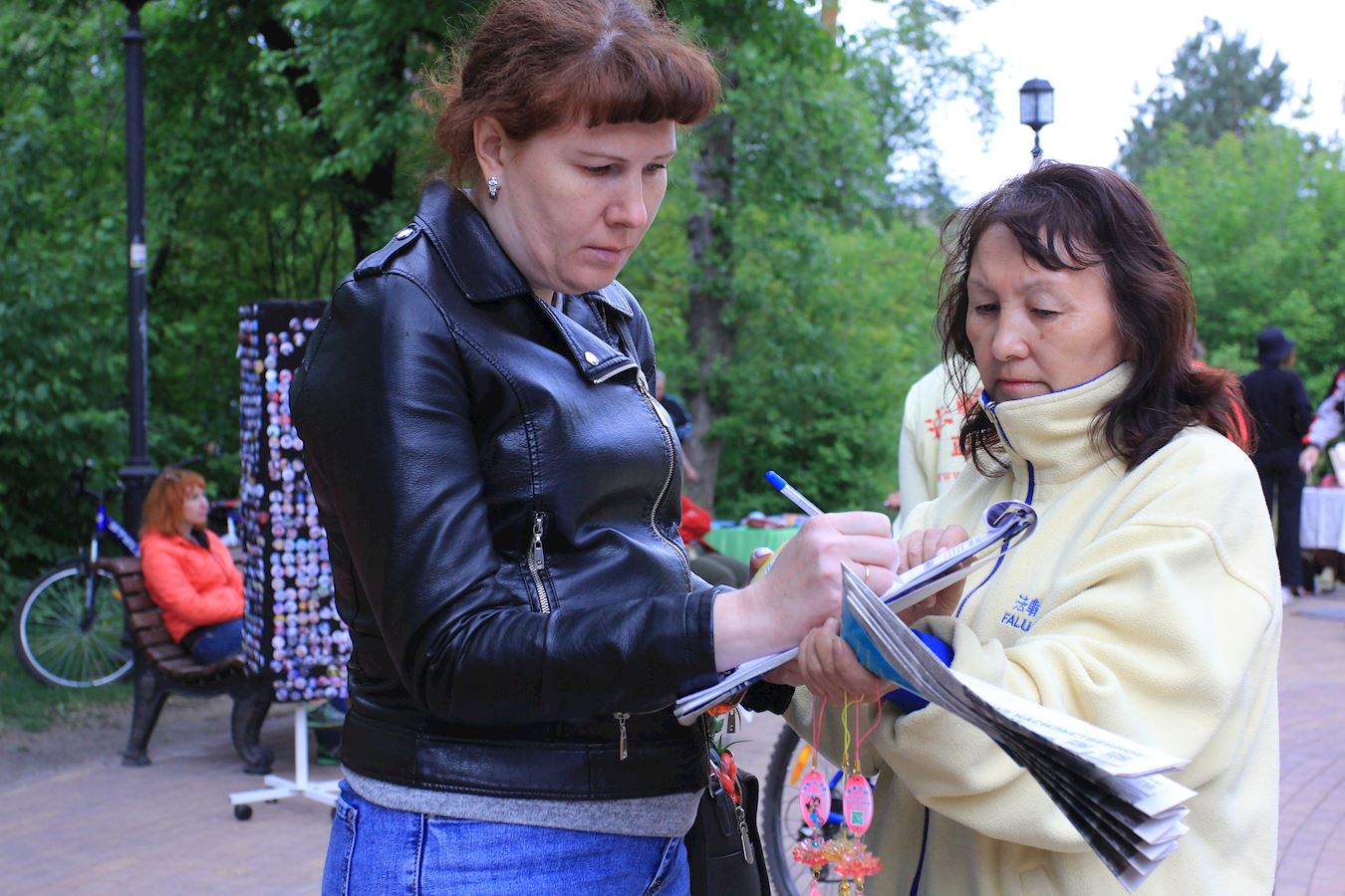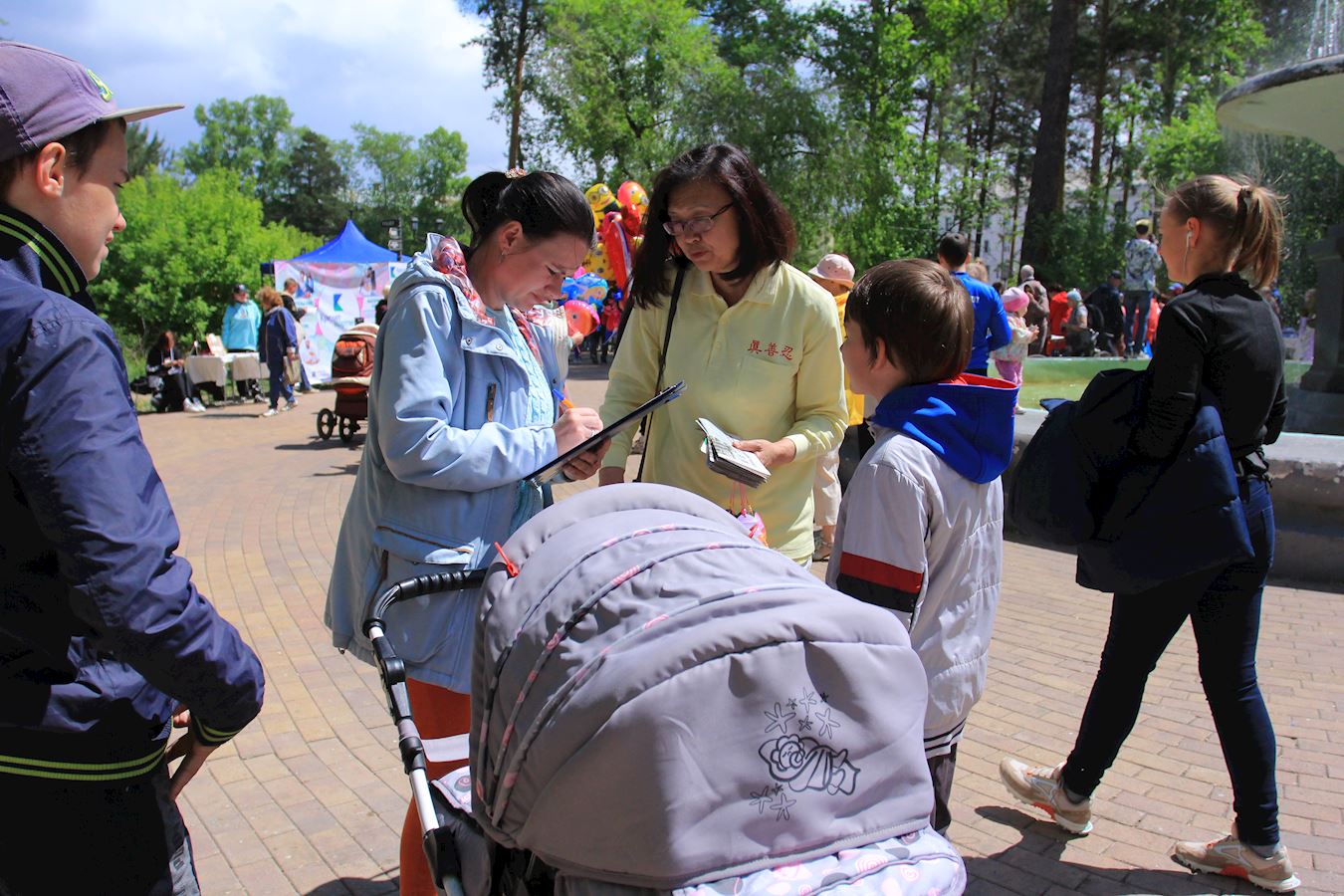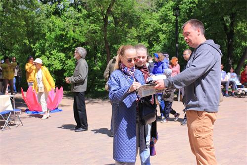 学员们在活动中,有的展示法轮功的功法,有的教授制作莲花,有的发放法轮大法资料、向人们介绍功法和宇宙特性——真、善、忍。学员们还告诉人们中共对中国法轮功学员的迫害。也有一些学员在现场征集“打倒中共恶魔”(ENDCCP)全球联署签名,签名已经在西伯利亚地区征集了近一年。很多人驻足聆听中共邪恶犯罪的真相,以及中共迫害法轮功的真实原因并在签名簿上签名。有些人感受到大法弟子的真诚和善意并信任他们,还没听完真相就要签字。