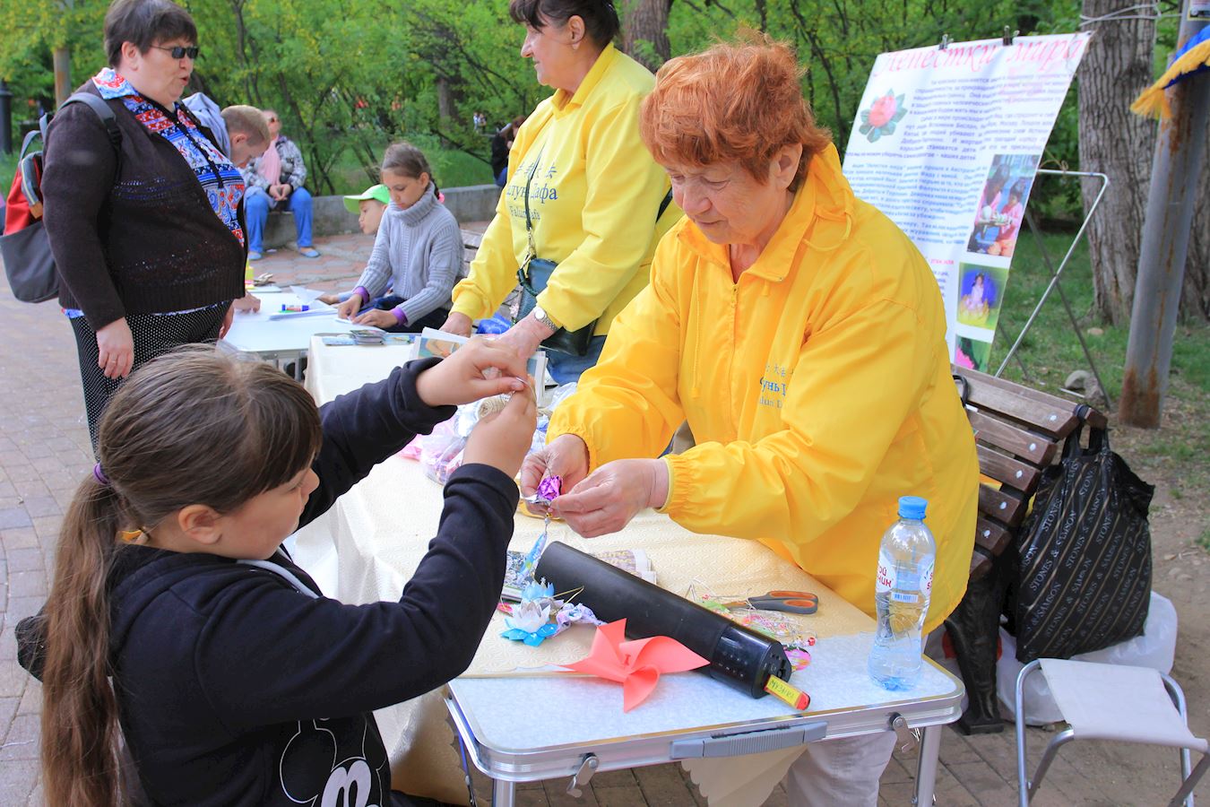 在该活动上,市民们在“石化学家”文化宫所在的公园里展示自己亲手制作的艺术品和手工艺品。法轮功学员在公园一角展开横幅和美丽的大莲花,装点了节日的公园。