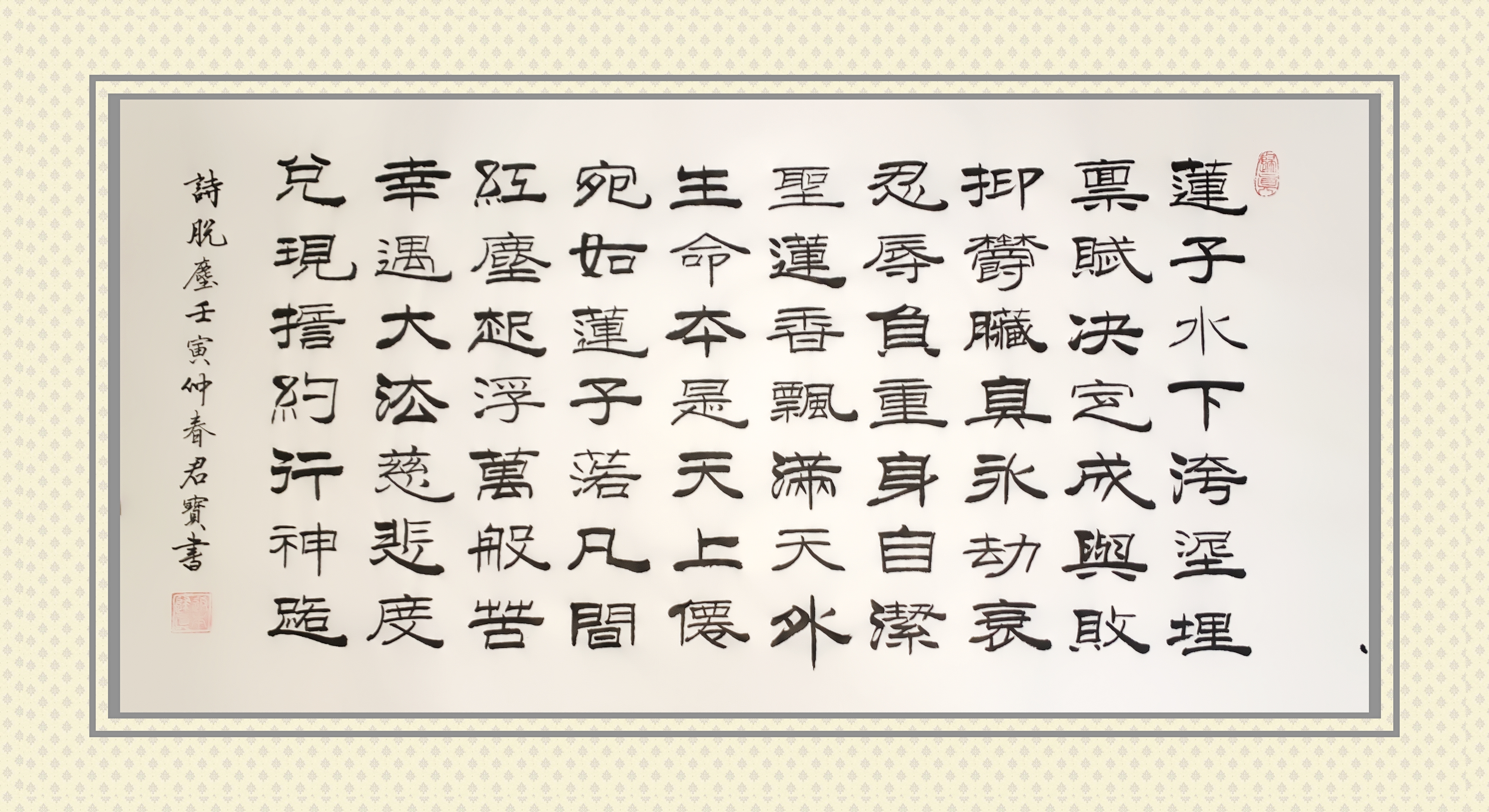 脱尘莲子水下污泥埋 禀赋决定成与败抑郁脏臭永劫衰 忍辱负重身自洁圣莲香飘满天外 生命本是天上仙宛如莲子落凡间 红尘起浮万般苦幸遇大法慈悲度 兑现誓约行神路