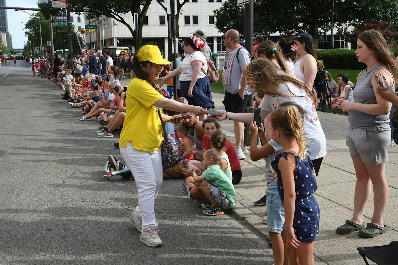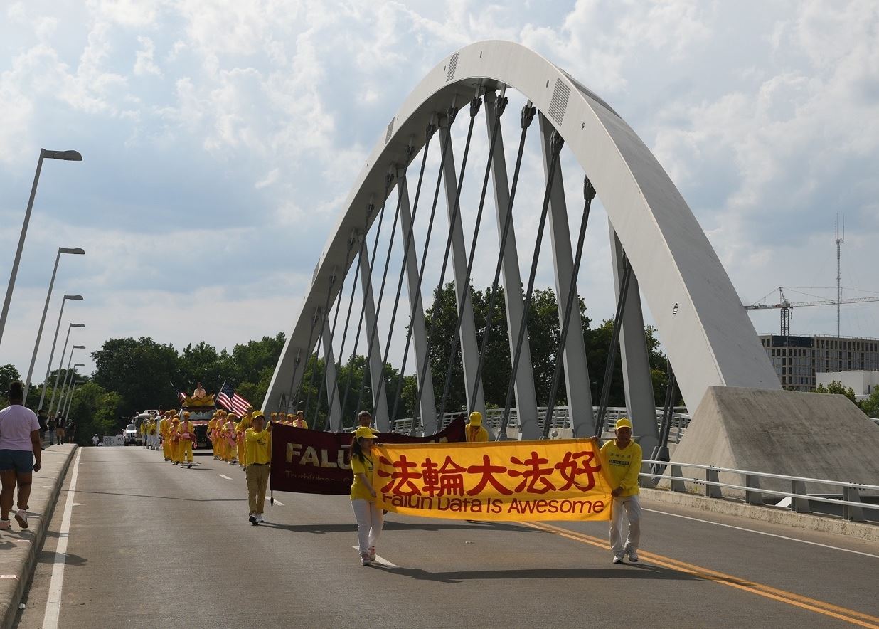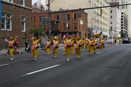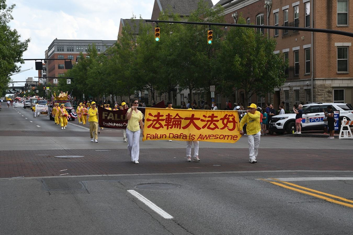 俄亥俄州和部份周边地区的法轮功学员们一起参加了独立日游行。游行从主街(Main St)开始,跨越赛奥托河(Scioto River)。法轮功学员的队伍最前方是手持中文“法轮大法好”与英文“Falun Dafa is Good”的法轮功学员。游行中法轮功学员组成的腰鼓队演奏了“法轮大法好”和“喜庆”两首曲目,为美国独立日增添节日气氛。腰鼓队身后是游行花车,花车上的法轮功学员展示了祥和的五套功法。