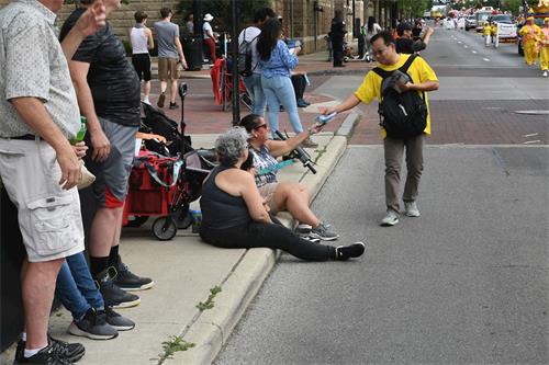 ![]() 图5~6:跟随游行队伍的法轮功学员向民众发放真相传单并介绍法轮功 |