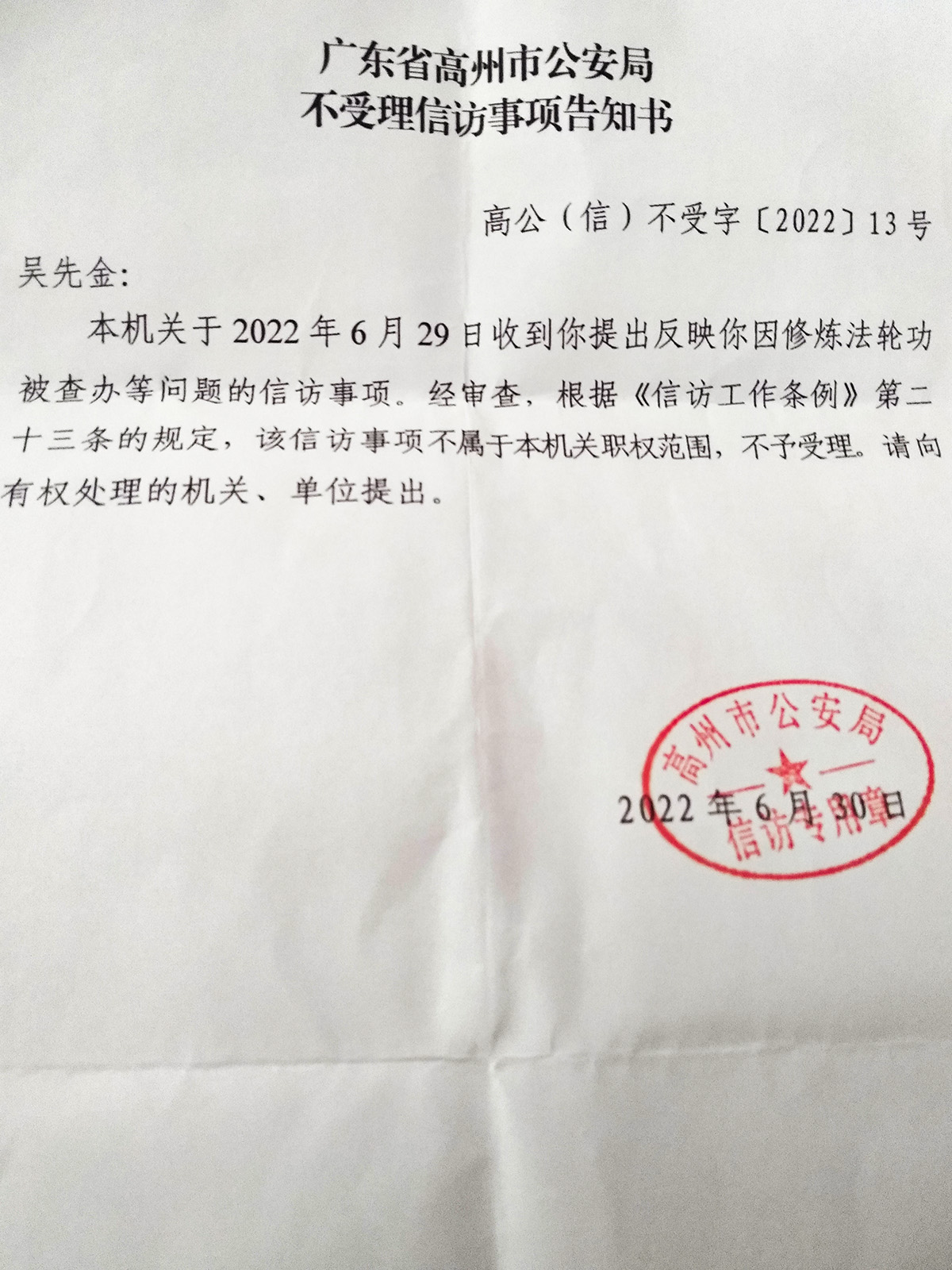 由于正常工作、生活遭严重骚扰、侵害,吴先金于六月二十九日就此事以信访形式向高州市公安局投诉,要求高州市公安机关履行保护居民人身权利、住宅安全、财产权利的法定职责,查处违法行为。但高州市公安局拒绝受理。日前,吴先金已聘请律师介入此案。