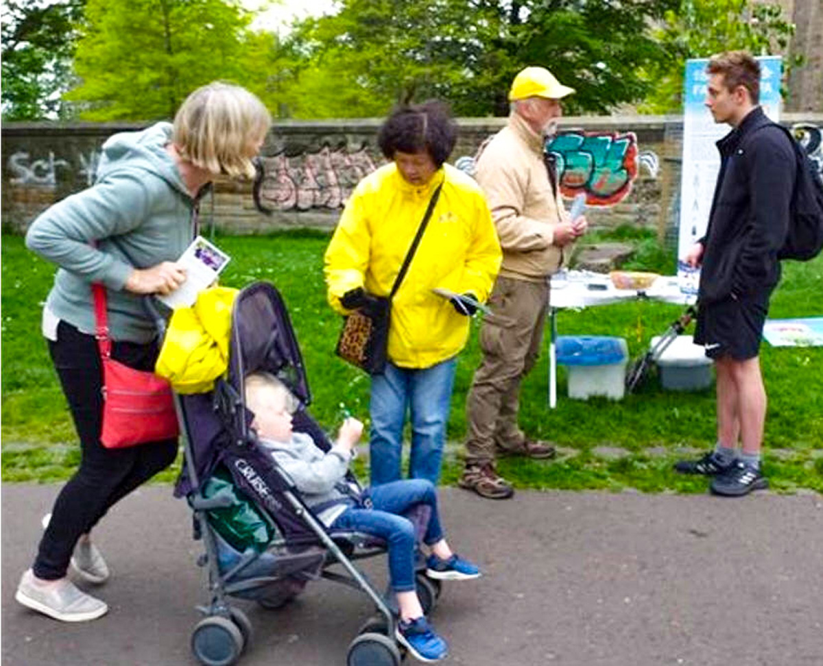 ![]() 图7:法轮功学员卡伦(中),正在向路人传播真相。 |