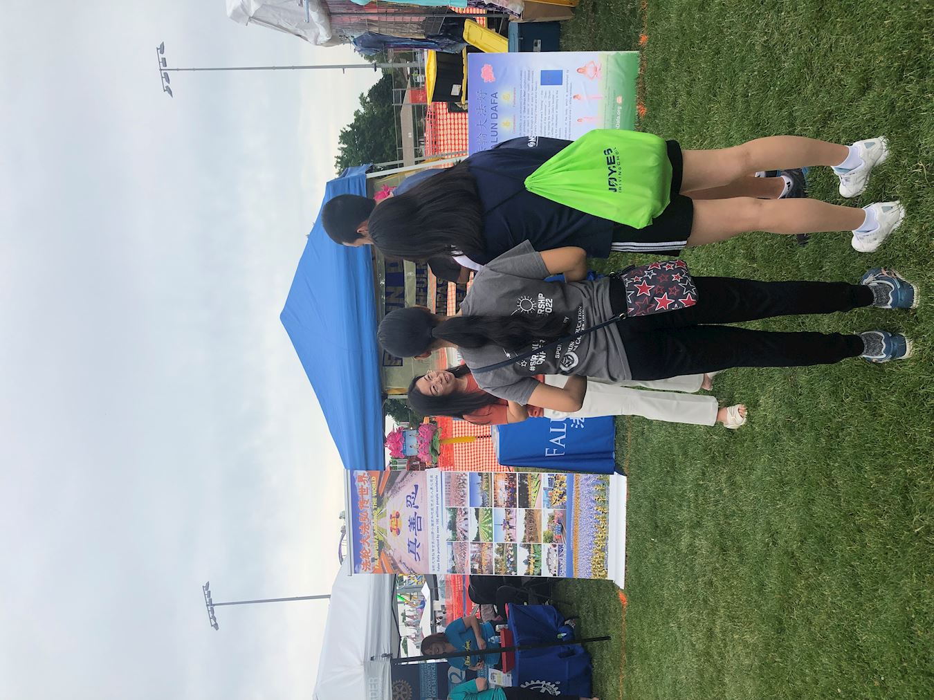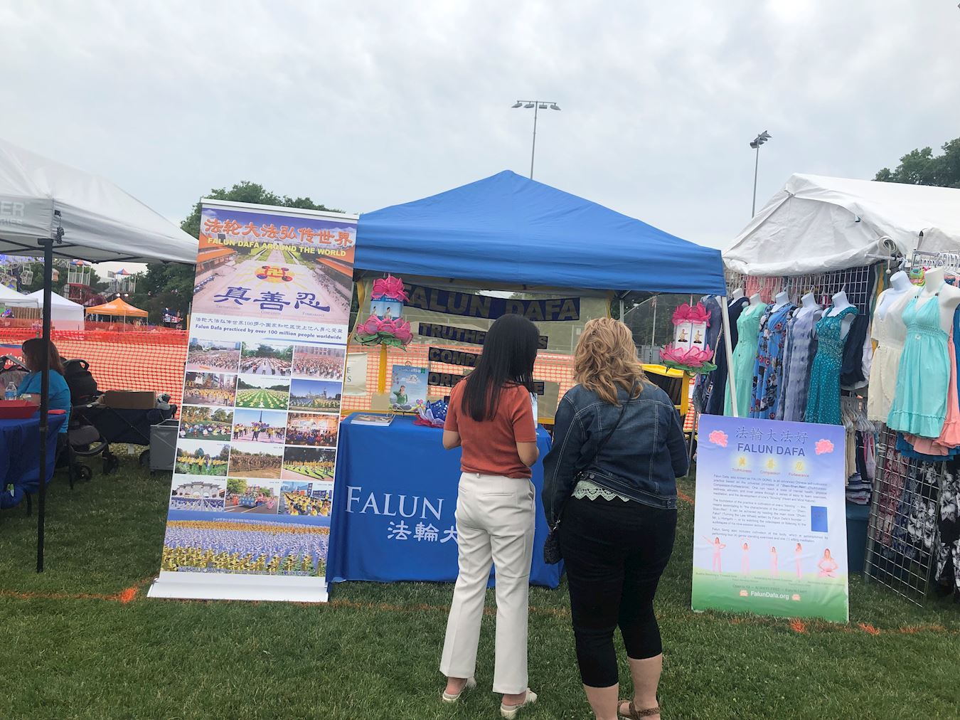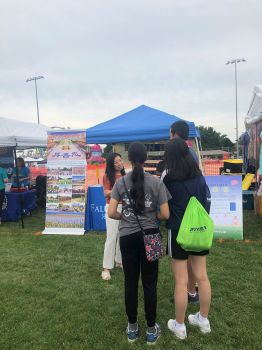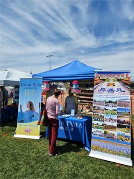 法轮功学员在展位上布置了法轮大法的简介,和“法轮大法弘传世界”的展板,桌面上放有真相传单、小册子,和印有炼功点信息的卡片。展位上还点缀着学员手制的精美的莲花。学员们伴随着祥和的炼功音乐展示功法,吸引人们驻足观看,并询问更多详情。