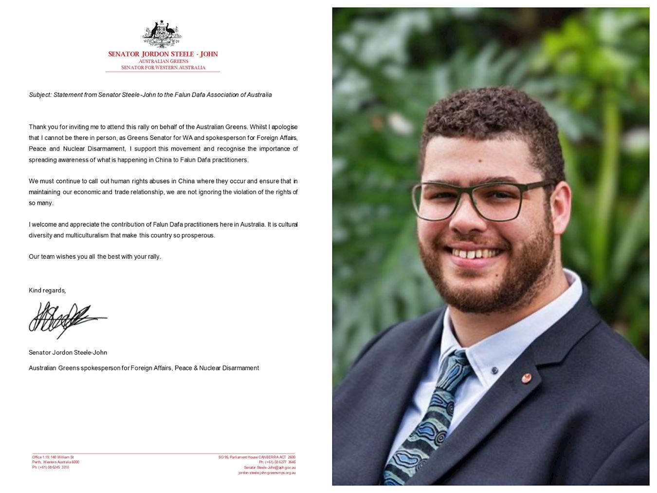 澳洲联邦绿党参议员、绿党外交事务发言人斯蒂尔-约翰(Jordon Steele-John)先生在声援信中说:“我支持这个(反迫害集会)活动,这对于人们了解发生在中国的对法轮功修炼者迫害的真相,非常重要。”“我们不会忽视对这么大规模(法轮功群体)的权利侵犯。”