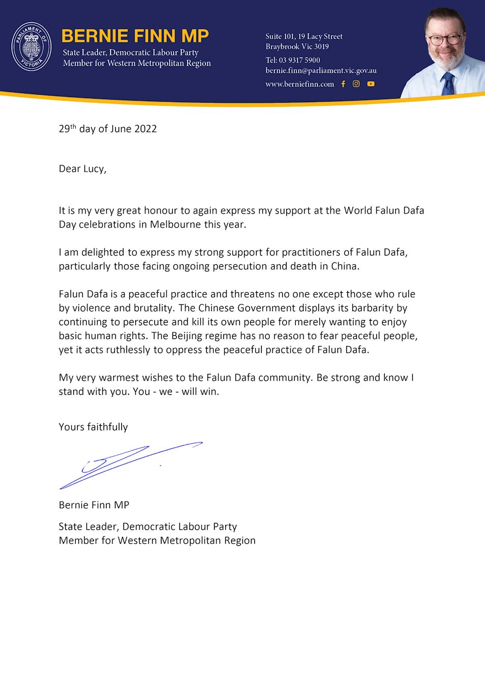 民主工党维州领袖菲恩(Bernie Finn MP)先生在支持信中再次重申,强烈支持法轮大法修炼者,“我们一定会赢”。