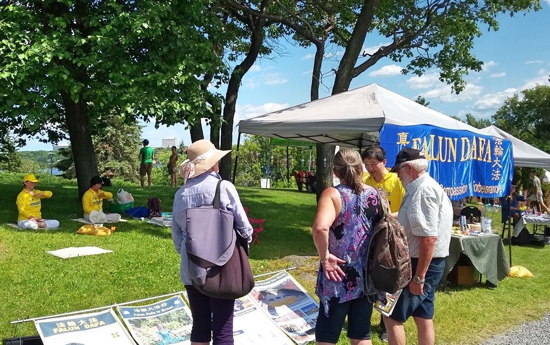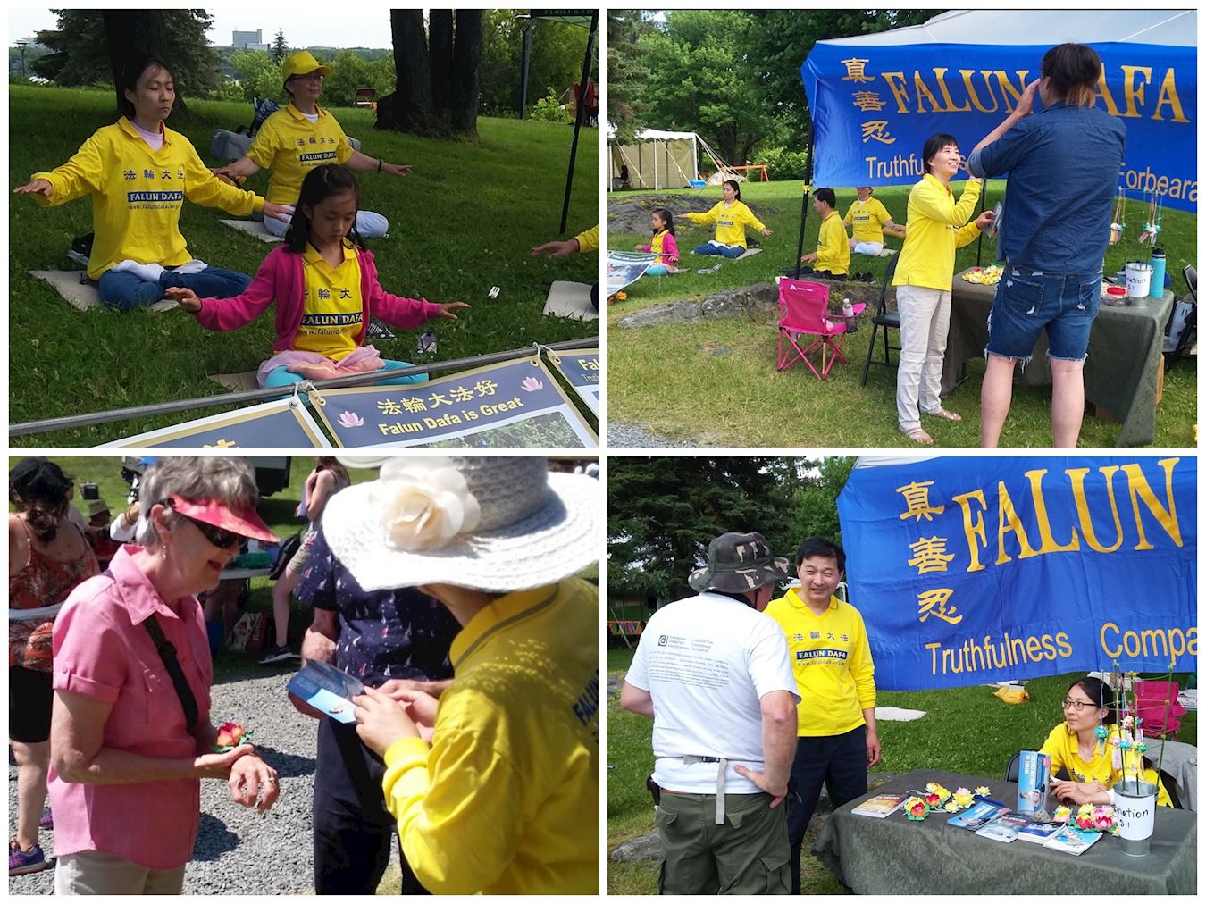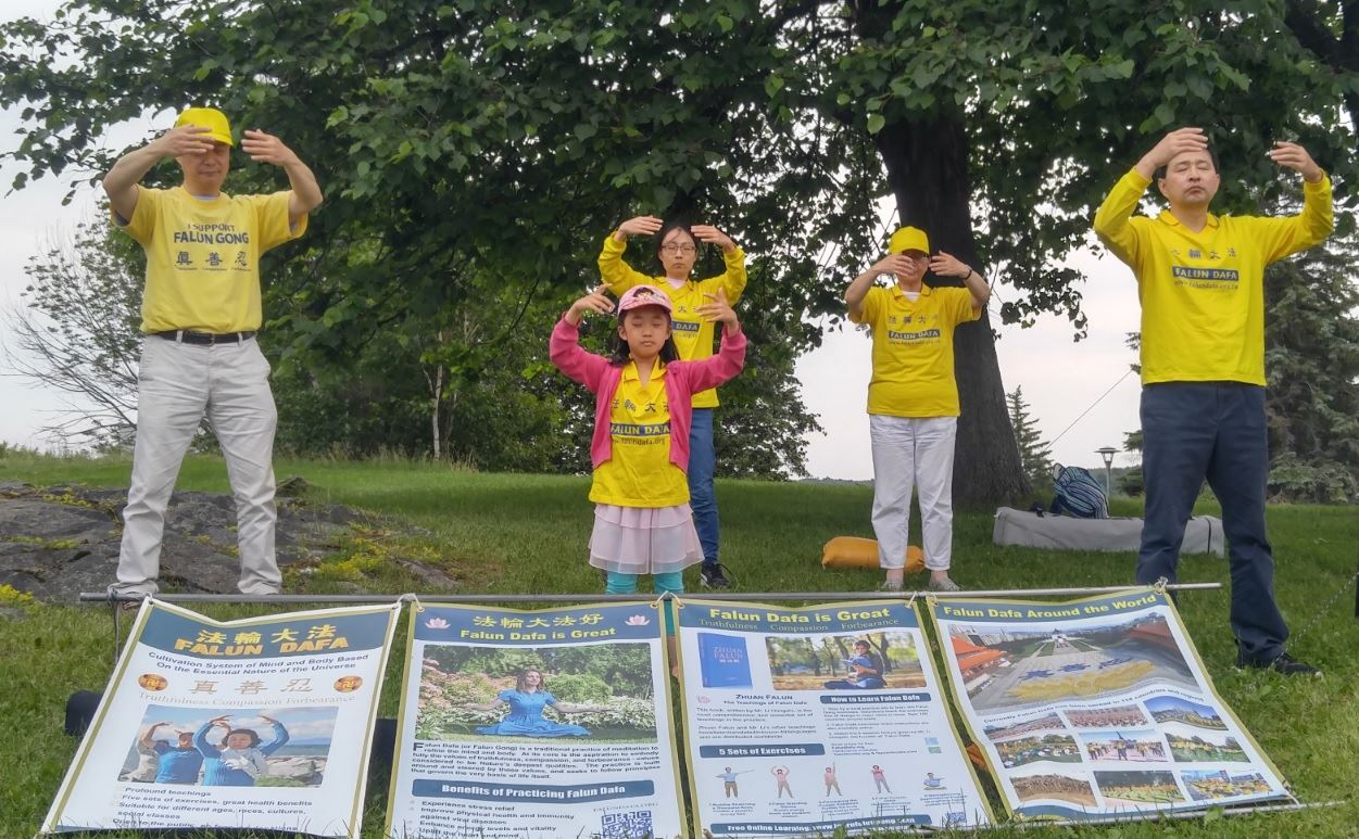 七月九日,阳光灿烂,微风凉爽,近中午时,游客逐渐增多。我们在悠扬的炼功音乐的伴奏下炼起了五套功法,吸引了众多游客的目光。加拿大英语电视网络(CTV)的摄影记者也前来摄像。活动举办方的摄影师对我们的炼功演示进行了摄影,还问我们能否将我们的炼功照片放到他的facebook上。