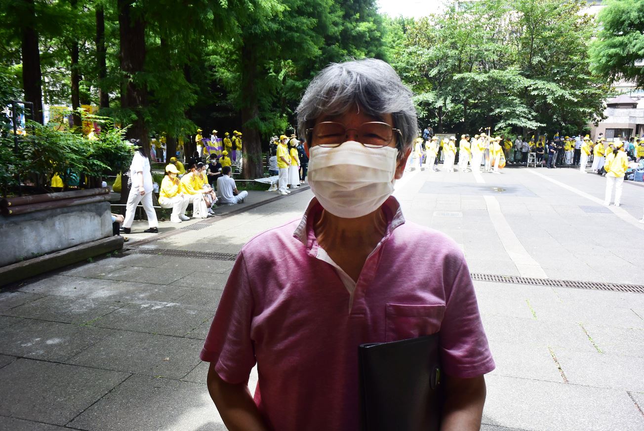 骑自行车来池袋购物的黑川先生在听完学员的解说后说:“为了维持政权体制而夺人性命不好。建立在夺取性命之上的统治和体制是错误的。”并为法轮功学员们加油。