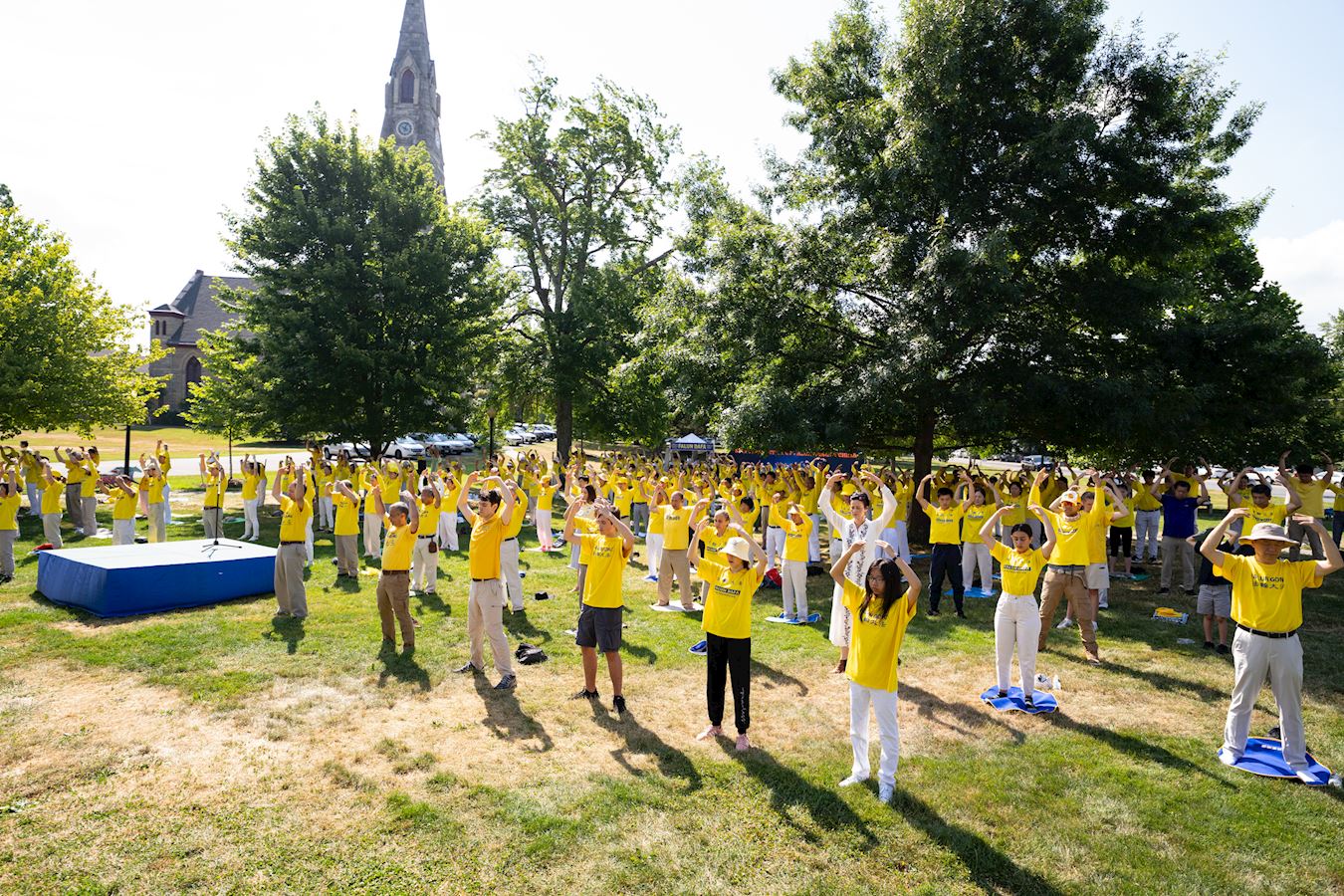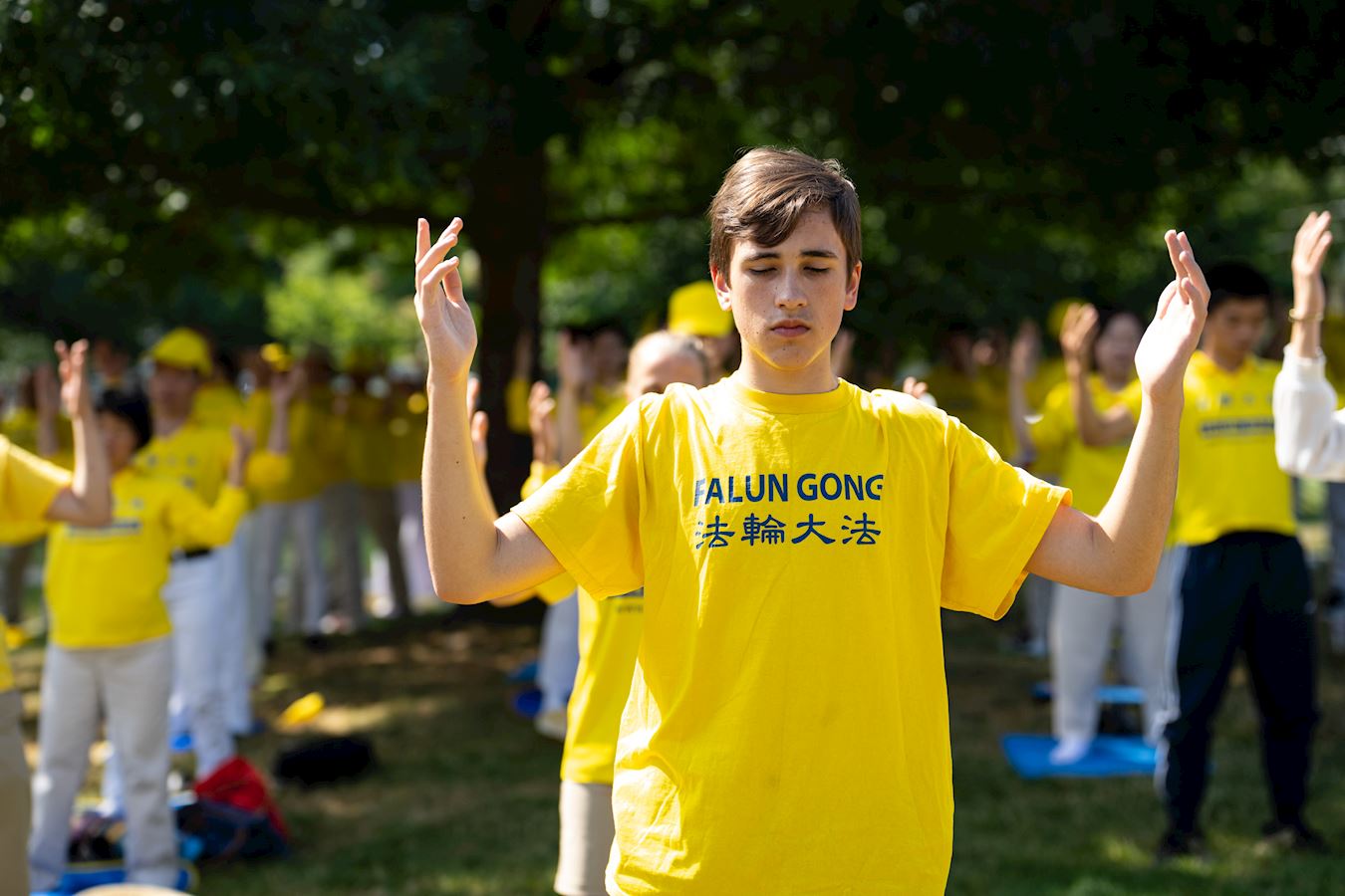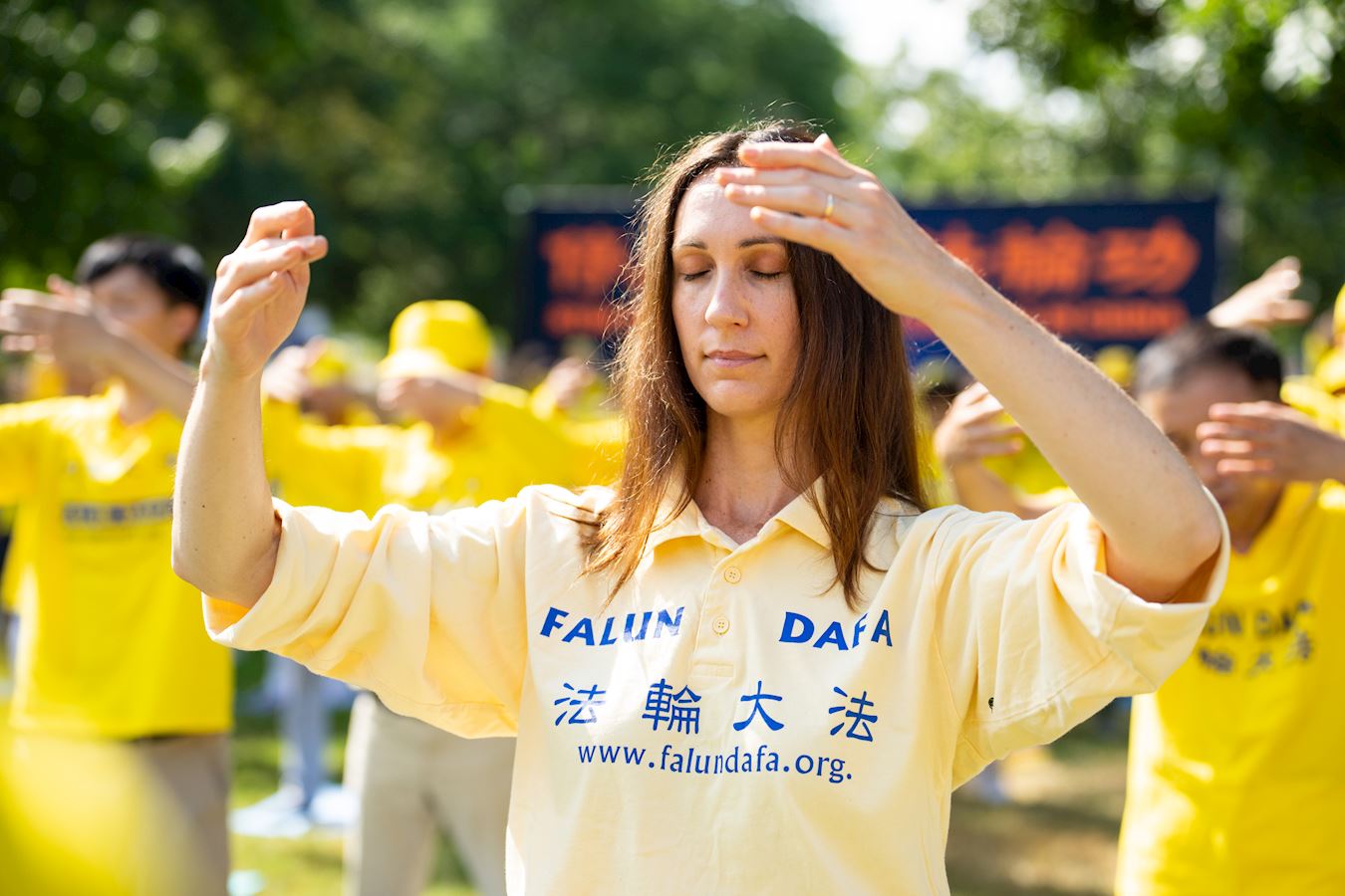 参加当天活动法轮功学员,上至逾八十岁的耄耋老人,下至几岁的孩童,在绿色的草坪上伴随着悠扬的音乐炼五套功法,祥和充满能量,向世人展示着法轮大法的美好。