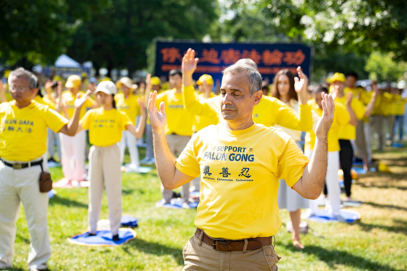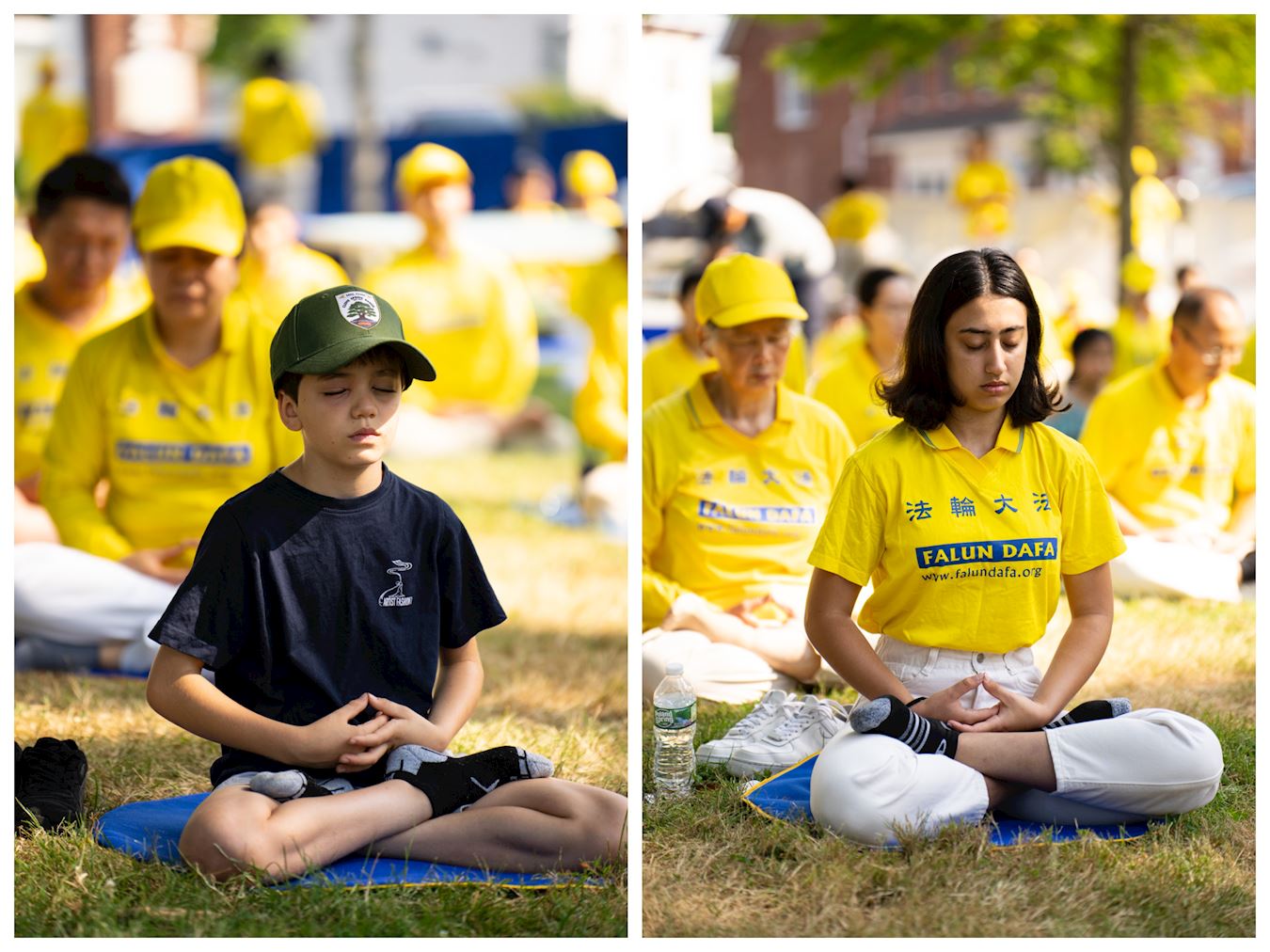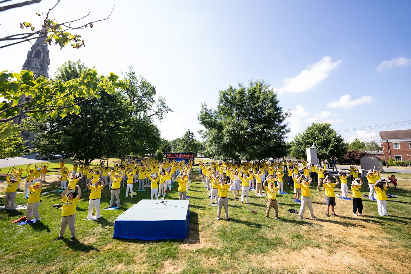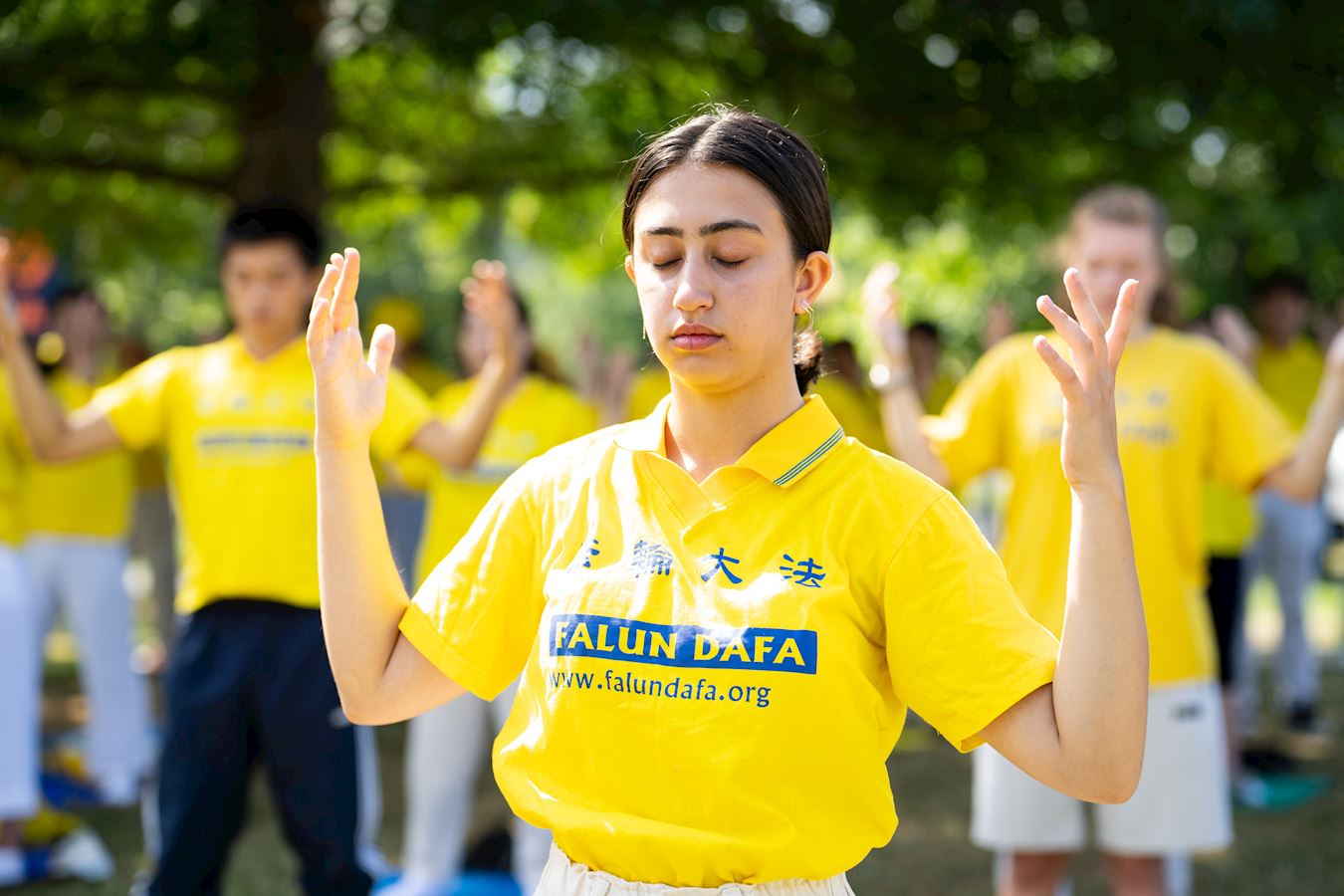 参加当天活动法轮功学员,上至逾八十岁的耄耋老人,下至几岁的孩童,在绿色的草坪上伴随着悠扬的音乐炼五套功法,祥和充满能量,向世人展示着法轮大法的美好。