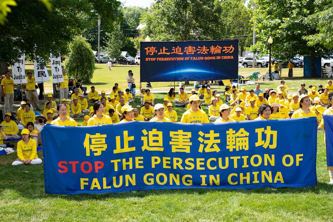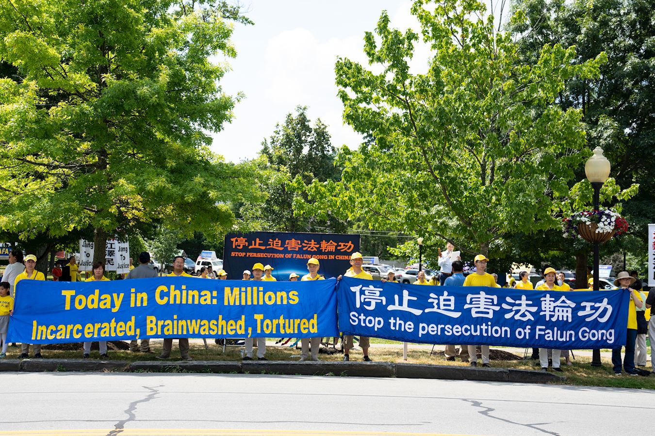 集体炼功结束后集会开始,学员们在集会现场面对大街上打出了多个大型中英文横幅,揭露中共持续至今的血腥迫害,并要求“法办江泽民”。