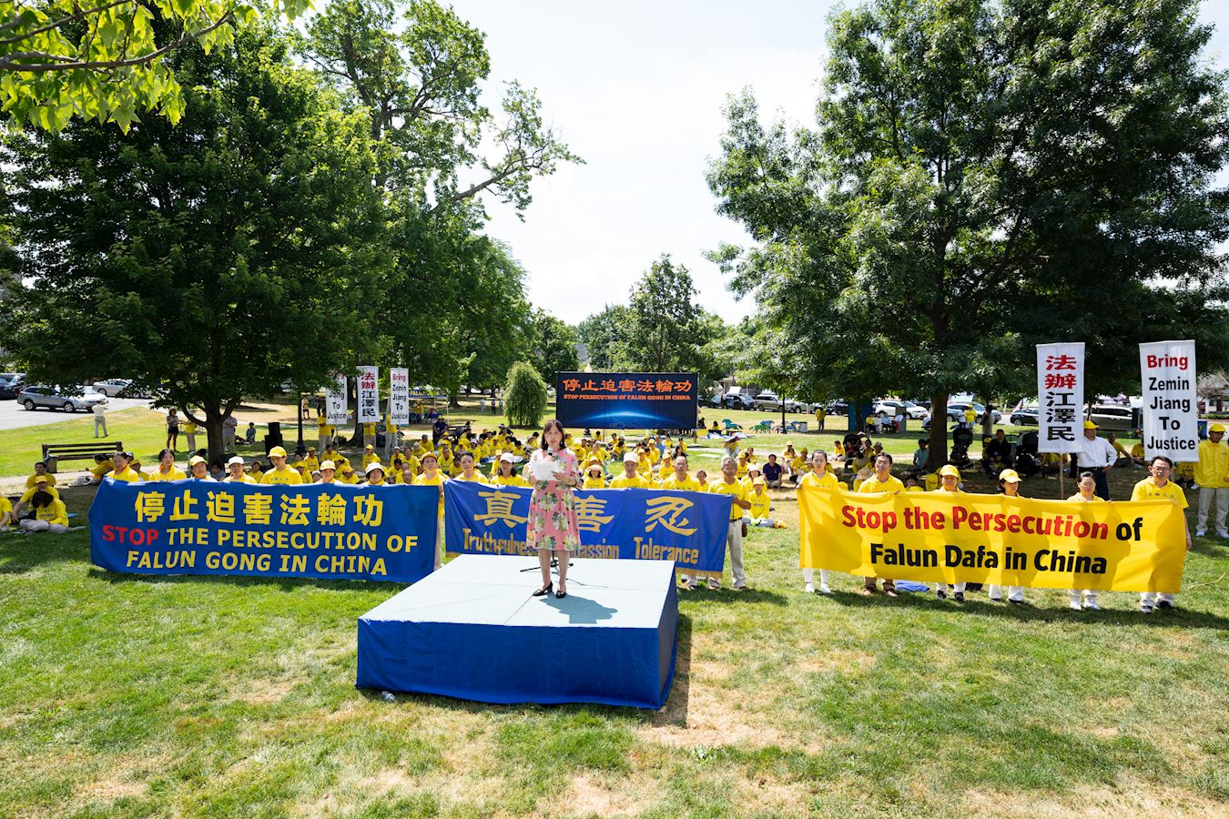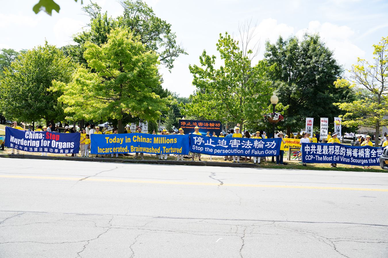 集会过程中,不时有驾车路过的民众,他们有的打开车窗,向法轮功学员招手致意;也有鸣笛表示支持。
