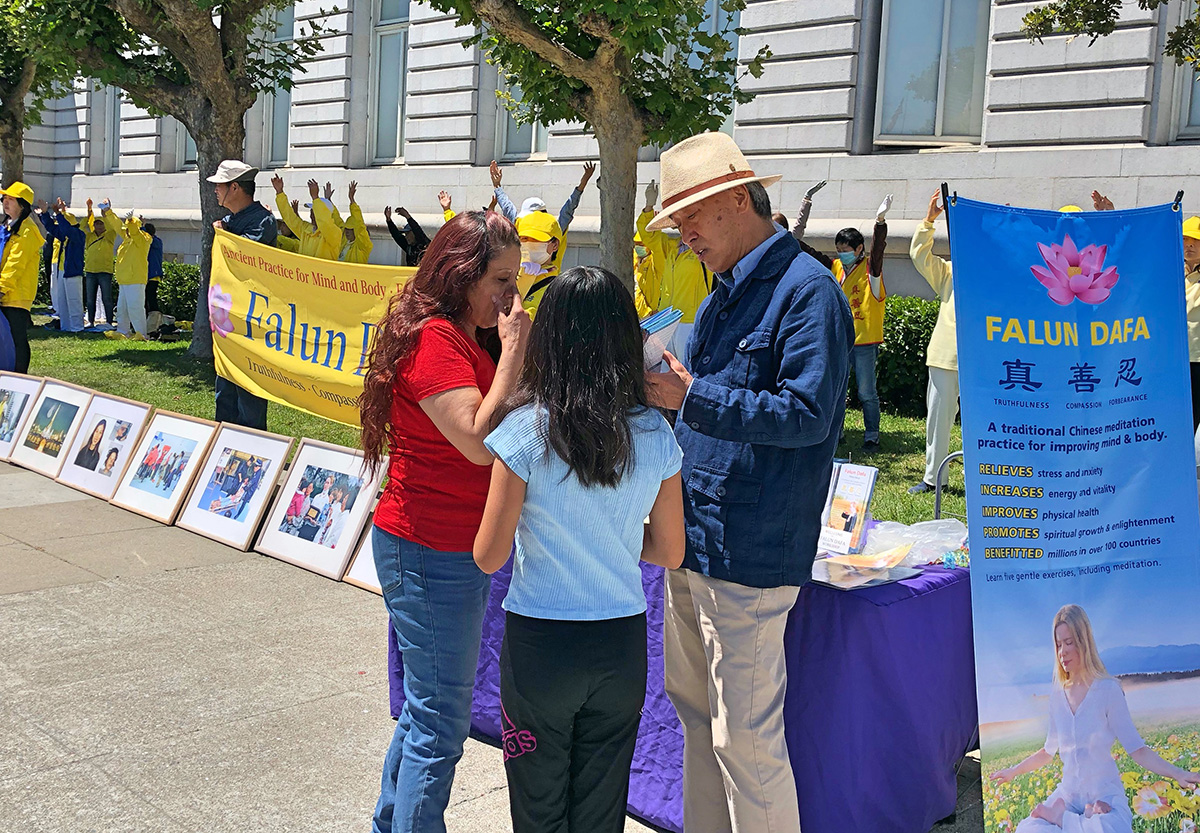 当天,经营一家食品公司的罗西(Rosie)带着女儿前来市政大楼送货,她的女儿拉着她到法轮功学员的展桌前。一位学员上前给她们介绍法轮功。罗西说,看到法轮功学员的炼功场面,她的心情马上平静下来。她和女儿都感受到很好的能量场。学员告诉她,法轮功基于真、善、忍原则,通过五套功法,能提升人的身心健康。她说:“这就是我要的。”她还询问哪里可以学功。当得知她家附近就有炼功点时,她非常开心,她说:“我一定会去学的。”