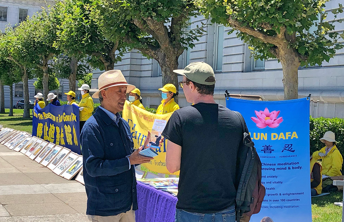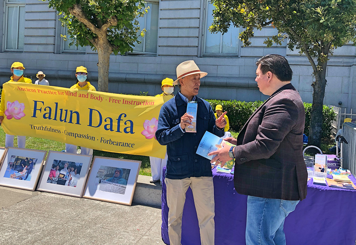 维特罗(Vitro)是一位大学生,当天他与父亲吉姆(Jim)从加州首府到旧金山市政厅办事,邂逅法轮功。他们与学员攀谈良久。他的父亲还当场认真阅读介绍法轮功的真相传单。维特罗说,观看学员们炼功,感到很平静、祥和。当听说中共迫害法轮功,他气愤地说:这太糟糕了。吉姆(Jim)告诉学员,他们是从秘鲁移民来美的。他们了解共产党的极权专制,包括给人民洗脑,迫害信仰自由,杀戮无辜等。他表示支持法轮功学员和平反迫害。