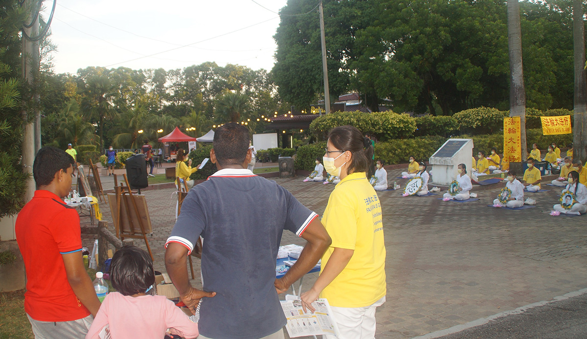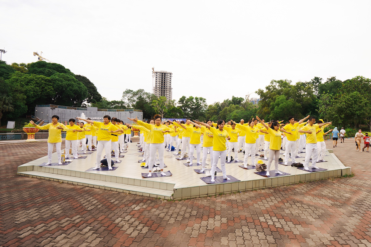 为更广泛的让更多地区的民众了解真相,七月十六日下午,部份法轮功学员来到雪兰莪州皇城巴生(Klang)最大的绿肺休闲场所——人民公园(Taman Rakyat)举行集体炼功,讲真相以及“七二零反迫害二十三周年”哀悼会,悼念被中共迫害的同修,场面庄严祥和。