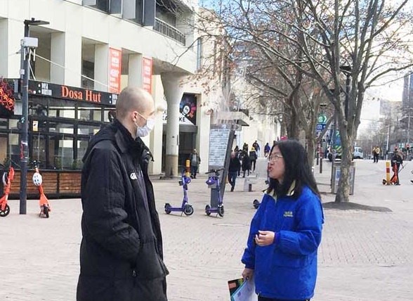 在堪培拉市中心的步行街,法轮功学员的真相展位和集体炼功,吸引民众驻足,有人阅读展板、有人主动拿取真相材料,在征签表上签名制止迫害,还有人在现场学炼法轮功。