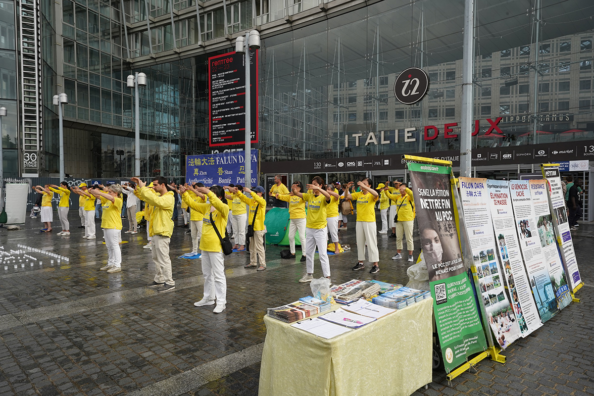 ![]() 图2:二零二二年七月二十日傍晚,在巴黎十三区的意大利广场,法轮功学员在演示法轮功功法。 |