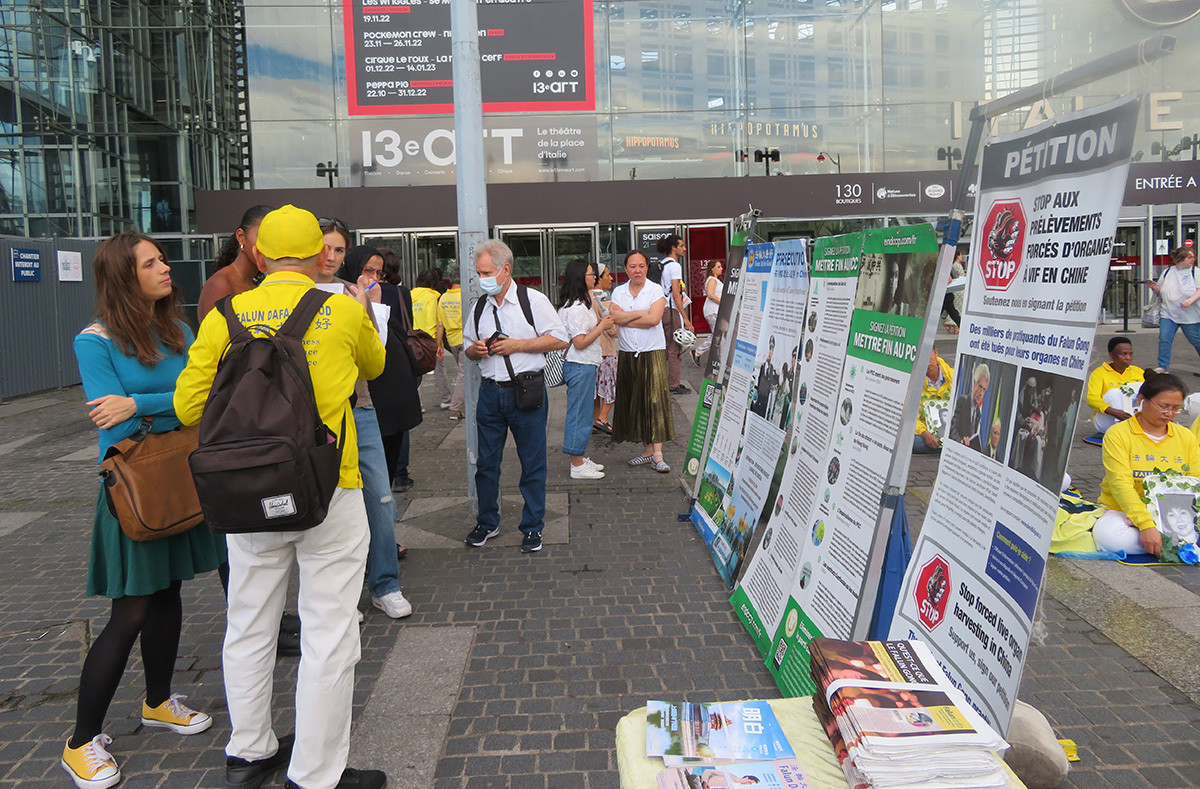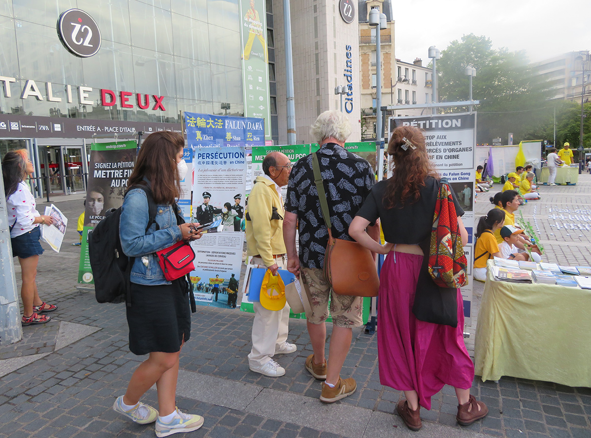 意大利广场是巴黎十三区政府所在地,一座大型商业中心也在此。雨过天晴,烛光悼念活动吸引了许多过往的人们。得知在中国的法轮功学员因为坚持信仰真、善、忍甚至失去生命,人们深受感动,他们佩服法轮功学员的勇气和信心,他们在征签表上签字,希望停止迫害。