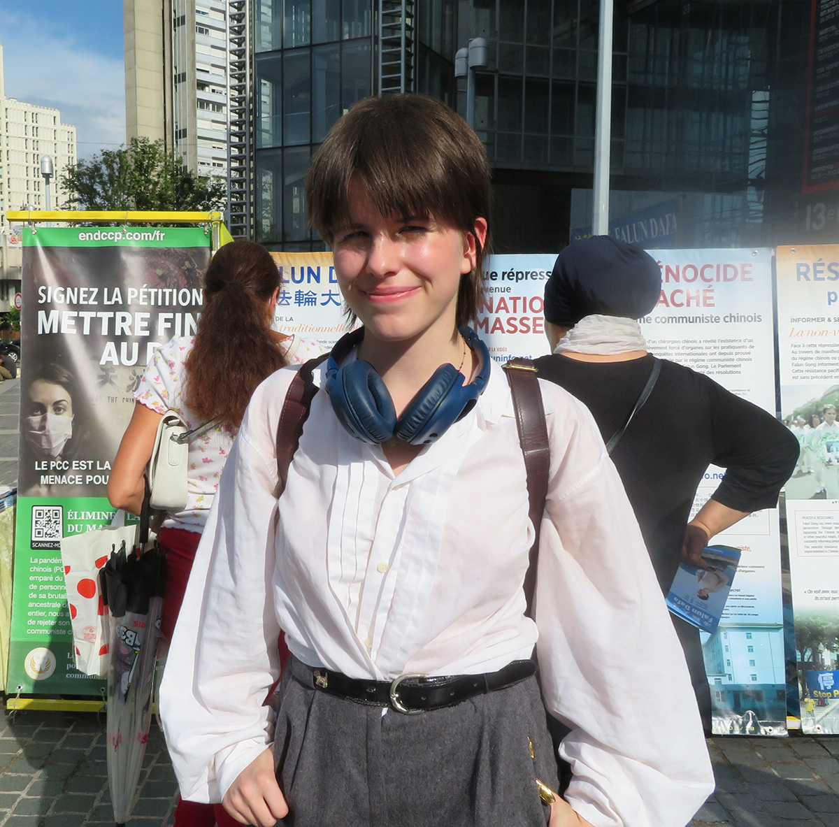 多玛(Thomas Rivière)是半工半读大学生,研读市场销售。他说:“九九年开始的迫害,二十多年过去了,现在人们才谈到,是因为有这个集会活动,我今天才知道,我觉得这不正常。”多玛今年二十二岁,第一次听说法轮功被迫害得如此惨烈,他很愤慨。