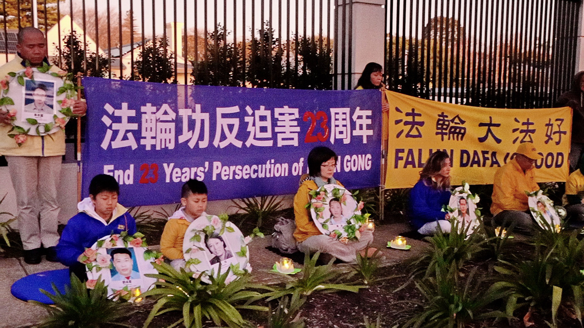 七月二十日傍晚,南澳部分法轮功学员在阿德莱德中领馆前举办烛光悼念,呼吁制止中共对法轮功的迫害。学员们手持有被迫害致死中国法轮功学员照片的花圈,静坐抗议。