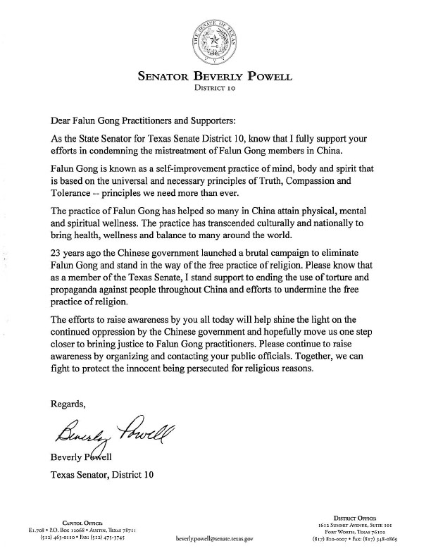 “23年前,中国政府(中共)发起了一场残酷的运动,以消灭法轮功并阻挠宗教自由实践。请知道,作为德州参议院的成员,我支持结束对中国各地人民使用酷刑和宣传以及破坏宗教自由实践的努力。