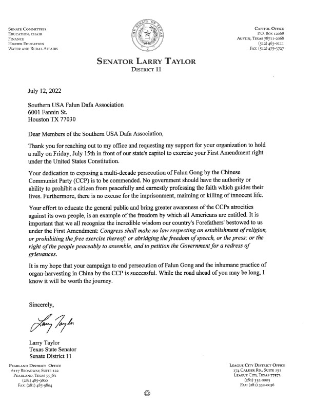 德州参议员拉里·泰勒 (Texas State Senator Larry Taylor)支持信函其中内容: