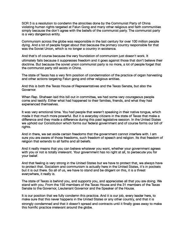 “去年在立法会议期间,我很荣幸与德州众议员马特·沙欣(Matt Shaheen)合作撰写参议院共同决议案(SCR3)[1] [2],以反对这种(活摘人体器官)做法,并让人们意识到(活)摘取人体器官的可怕做法。