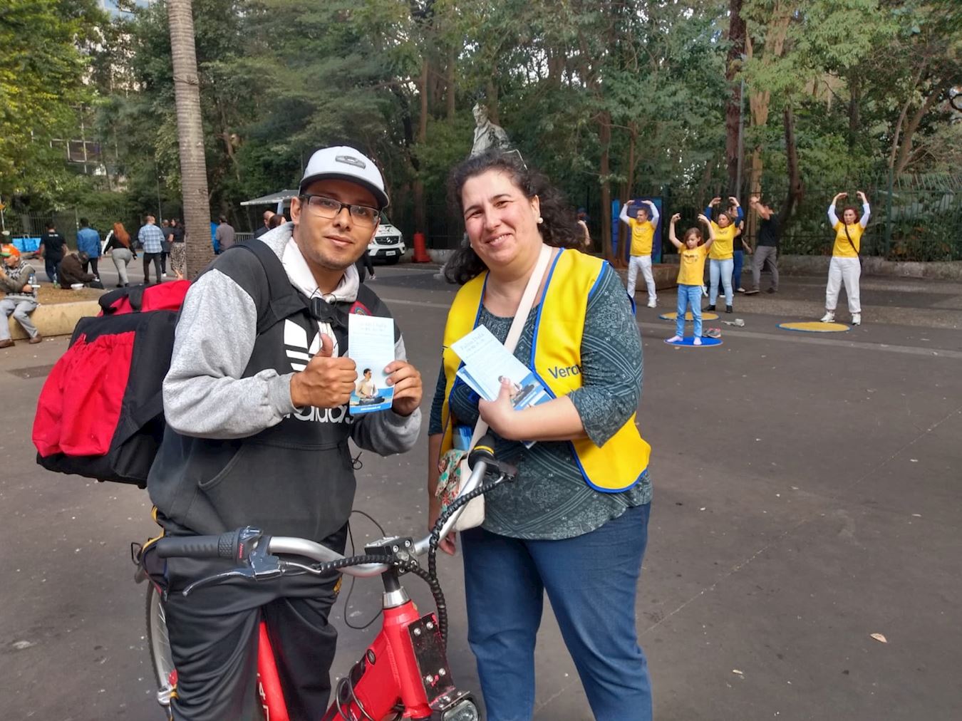 爱德华多是一位外卖员,他骑着自行车快速经过反迫害活动点。当大法学员递给他传单时,他猛的煞住车接过传单看起来。