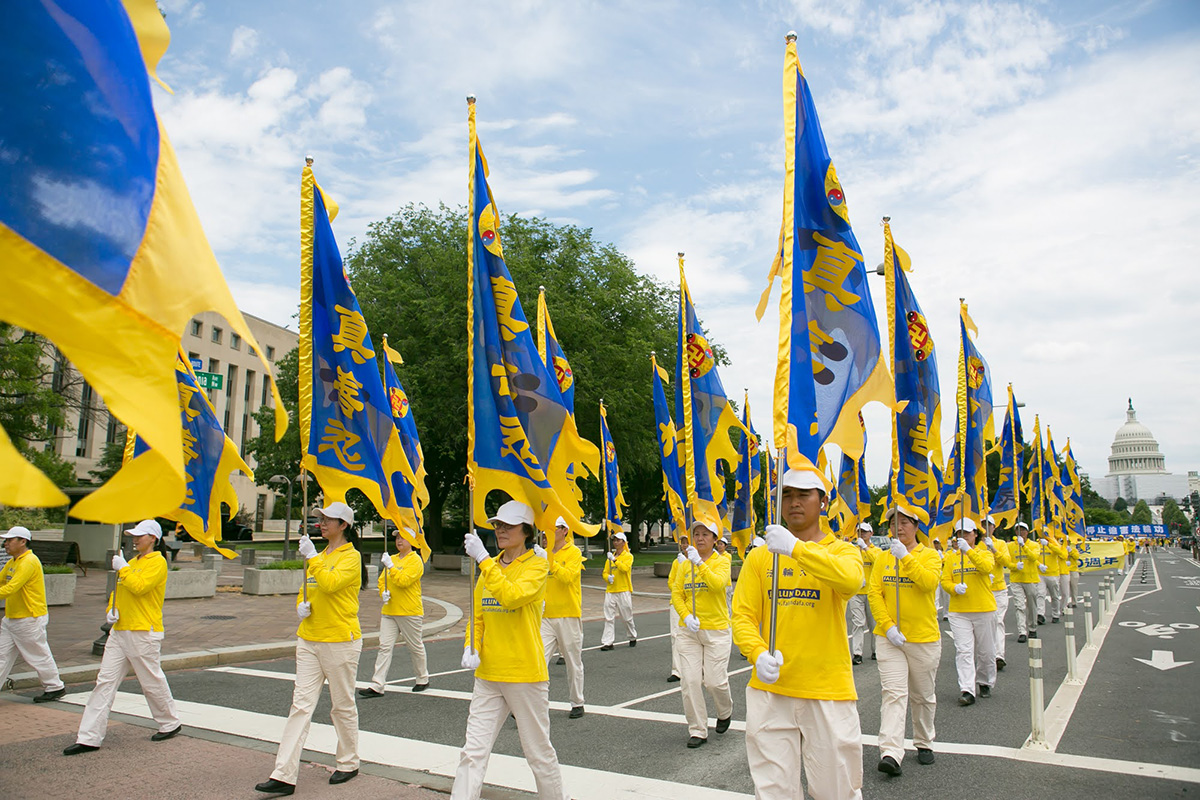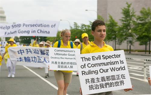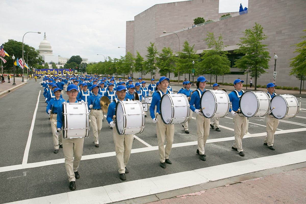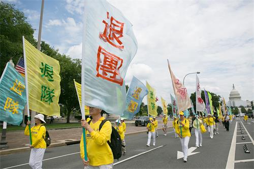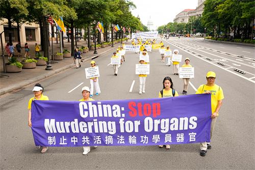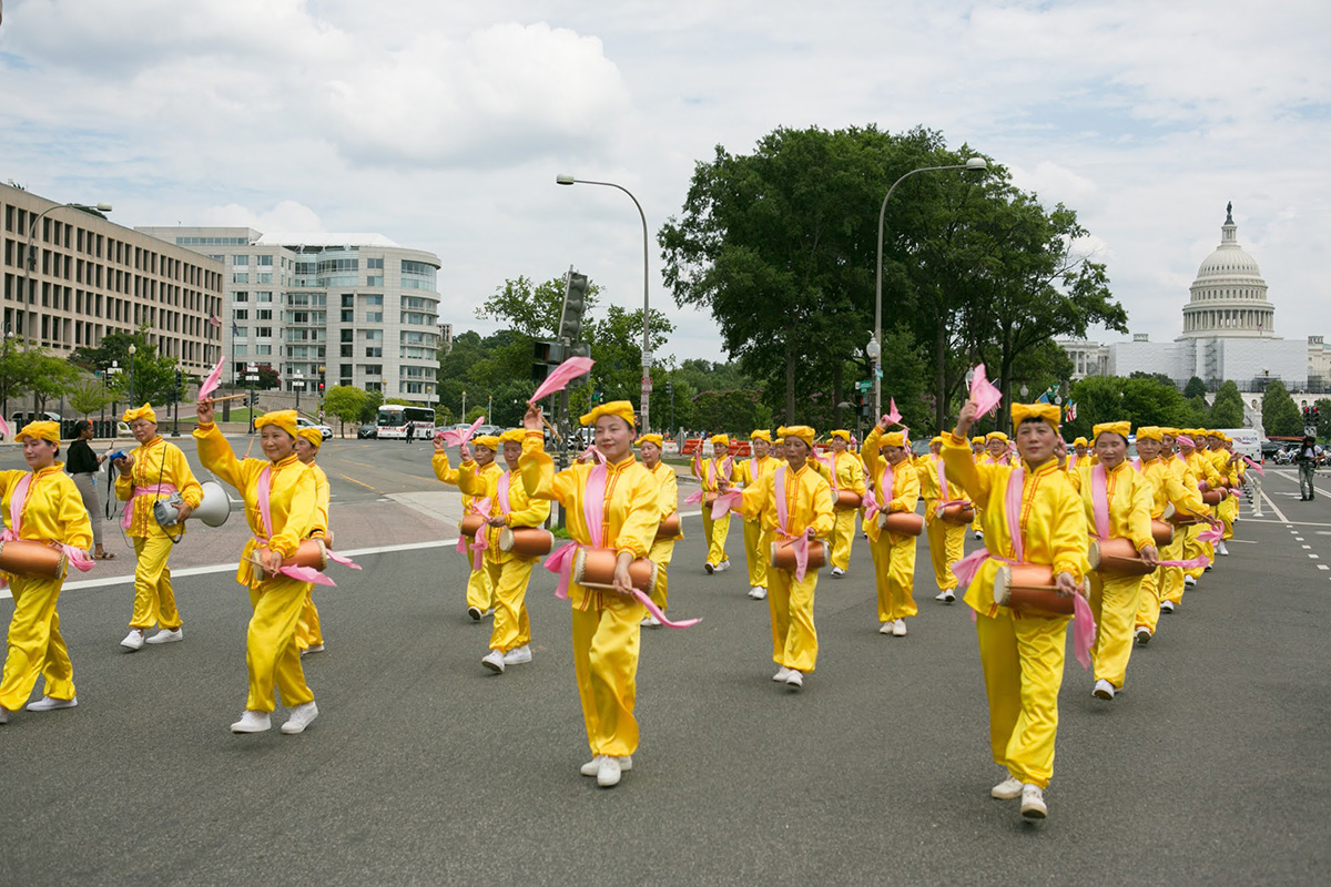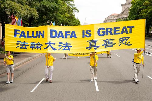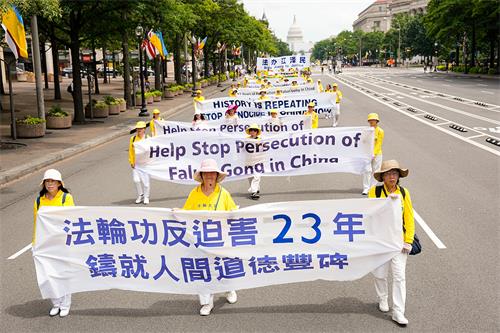 当天华府高达华氏九十多度,法轮功学员冒着酷暑,从临近国会山的三街出发,游行队伍浩浩荡荡,沿宾夕法尼亚大道,途经美国司法部等联邦政府大楼及外国驻美使馆,在自由广场结束,全程一英里。