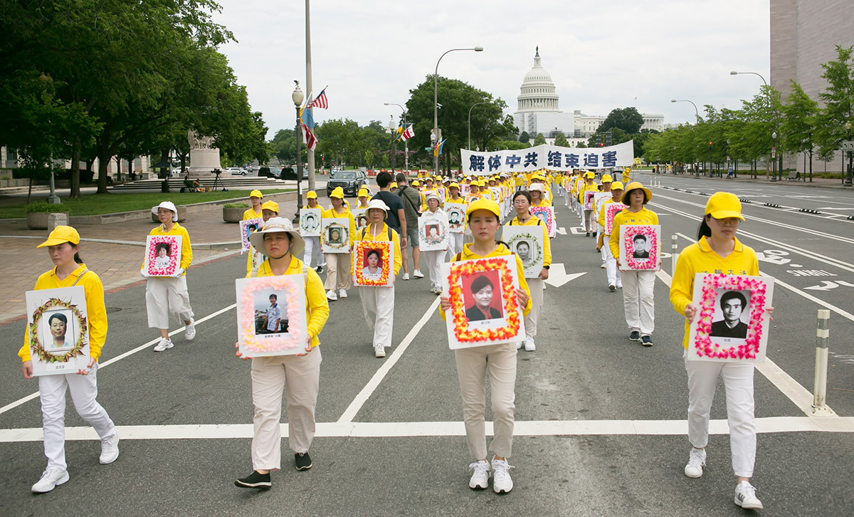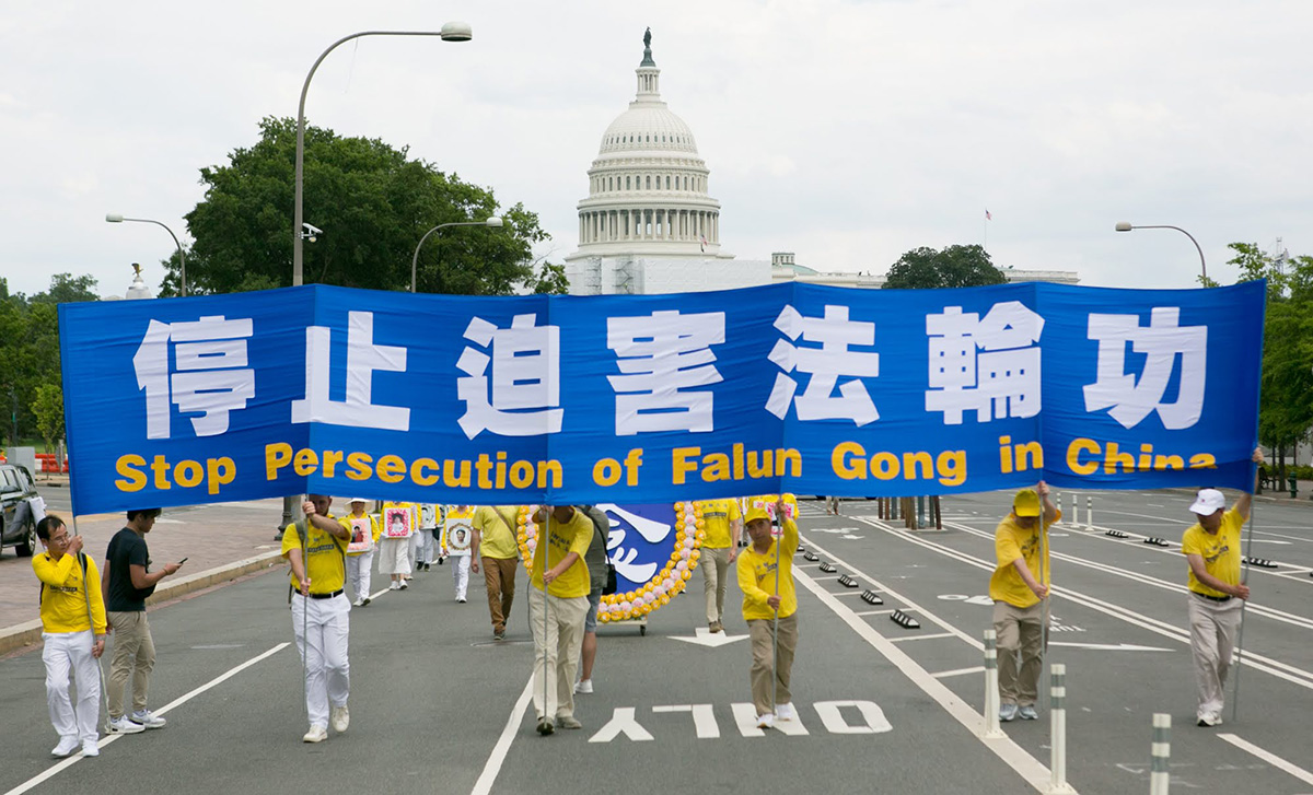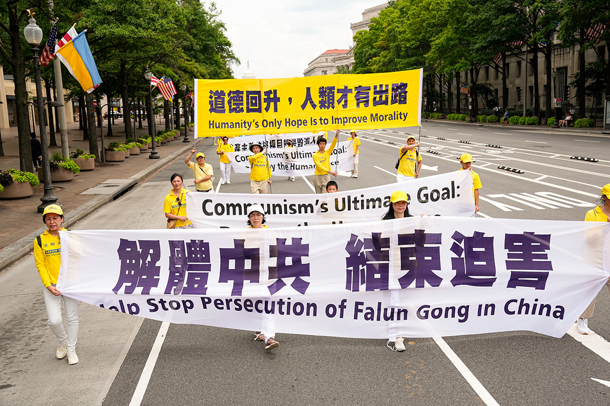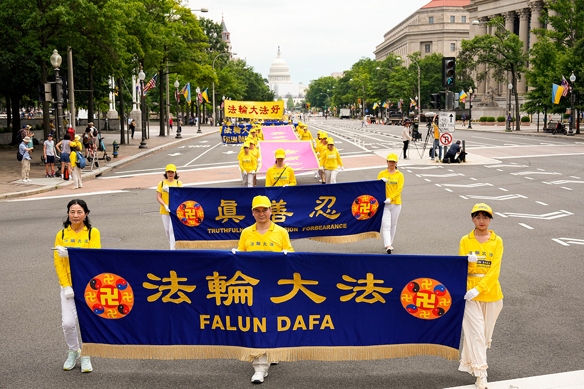 当天华府高达华氏九十多度,法轮功学员冒着酷暑,从临近国会山的三街出发,游行队伍浩浩荡荡,沿宾夕法尼亚大道,途经美国司法部等联邦政府大楼及外国驻美使馆,在自由广场结束,全程一英里。
