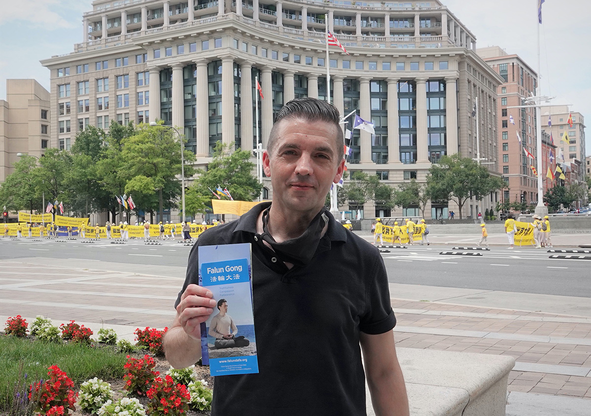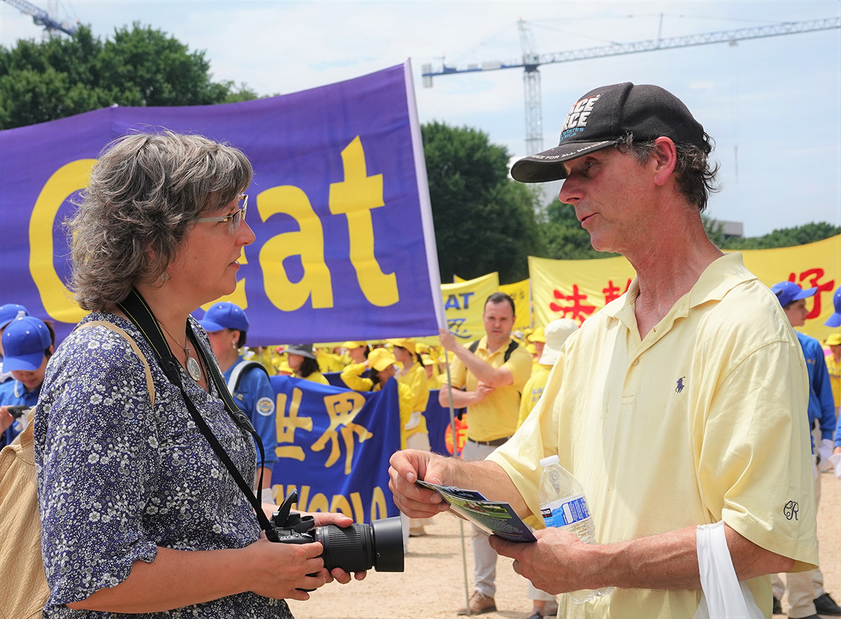 布朗冒着酷暑,在游行起点不停地向过往的行人介绍法轮大法。他说:“每年七•二零我都来华盛顿DC参加反迫害活动。能成为法轮大法修炼群体的一员,我感到非常荣幸。我从修炼中受益很多,我要回报,我要分享我的修炼体会,同时让更多了解中共发动的这场恐怖迫害。”