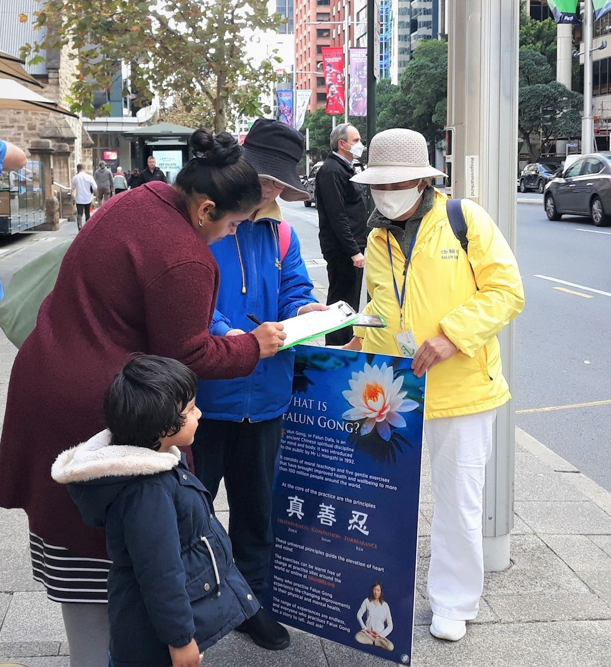 当天圣乔治大道上人来人往,不少路人停下脚步,向法轮功学员了解迫害真相,并在征签簿上郑重签下自己的名字,声援法轮功学员反迫害。有人表达震惊和痛心,有人表示错误行为不是中国民众所为,中国共产党不代表中国人民。也有华人经过,上前询问法轮功被迫害的真相。一位华人小伙经过横幅时,对法轮功学员说,“我和你们一样,我也不喜欢共产党”。当法轮功学员请他记住“法轮大法好,真善忍好”时,他点头表示感谢。