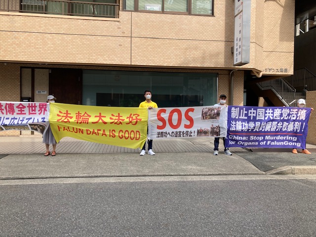 法轮功学员们在中领馆前打出了写有"法轮大法好”、"真善忍”、“法轮大法弘传全世界”、“停止迫害法轮功”及“制止中国共产党活摘法轮功学员的脏器牟取暴利!”内容的中英日文横幅。