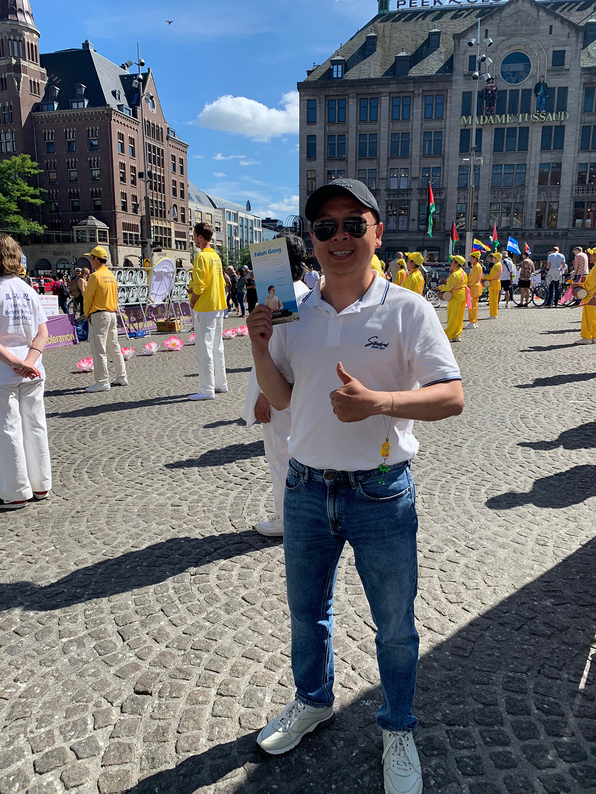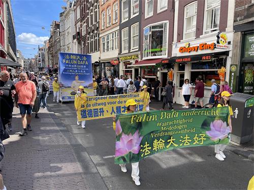 活动从下午一点开始。学员们演讲介绍法轮大法的美好和迫害的残酷,中间穿插功法演示和腰鼓表演。下午一点四十分左右,游行队伍从达姆(Dam)广场出发,途径达姆拉克大街,到达唐人街,再经达姆大街回到达姆(Dam)广场。沿途受到民众的欢迎。