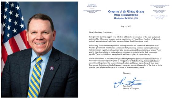 ![]() 图2:密苏里州第六选区国会众议员山姆·格拉维斯(Sam Gravis)在支持信中赞法轮功学员,说:“你们在这场反对暴政的斗争中的勇敢和奉献是自由实践你的信仰权利的极好例子,并为所有美国人树立了榜样。 |