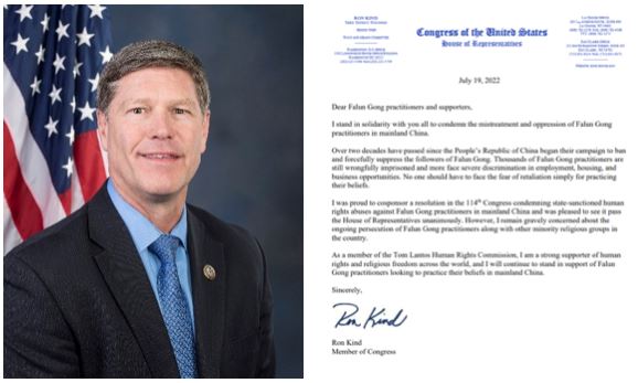 威斯康辛国会议员罗恩·金德(Ron Kind)在支持信中首先谴责中共对中国大陆法轮功修炼者的虐待和压迫。
