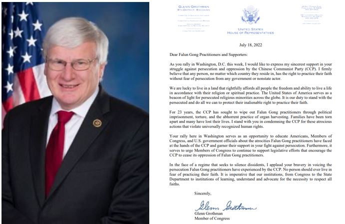 国会议员格伦·格罗斯曼(Glenn Grothman)在他给集会的支持信中说:“当你本周在华盛顿特区集会时,我想表达我对你们反对中共的迫害和压迫,最诚挚的支持。我坚定地相信任何人,无论他们居住在哪个国家,都有权实践他们的信仰,不必担心受到任何政府或非国家行为者的迫害。”