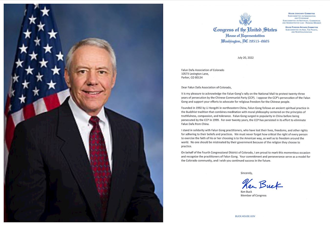 科罗拉多州第四选区联邦众议员肯·巴克(Ken Buck)在支持信中说:“法轮功在国家广场举行集会抗议中共二十三年来的迫害,我对此欣然表示认同。我反对中共对法轮功的迫害,支持你们倡导中国民众拥有宗教自由的努力。”