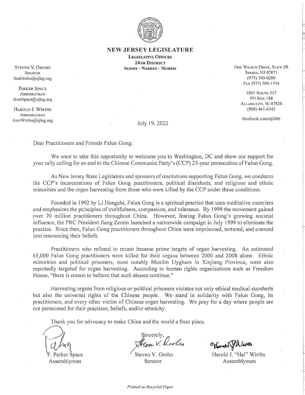 新泽西州参议员史蒂夫·奥罗霍(Steve Oroho)、众议员帕克·斯贝斯(F. Parker Space)和众议员哈罗德·沃斯(Harold Wirths)在支持信中说:“作为新泽西州议员和本州支持法轮功学员的数个决议案的提案人,我们谴责中共监禁法轮功学员、政治异见人士及宗教和少数民族群体,也谴责中共在这种情况下进行的活摘器官。”