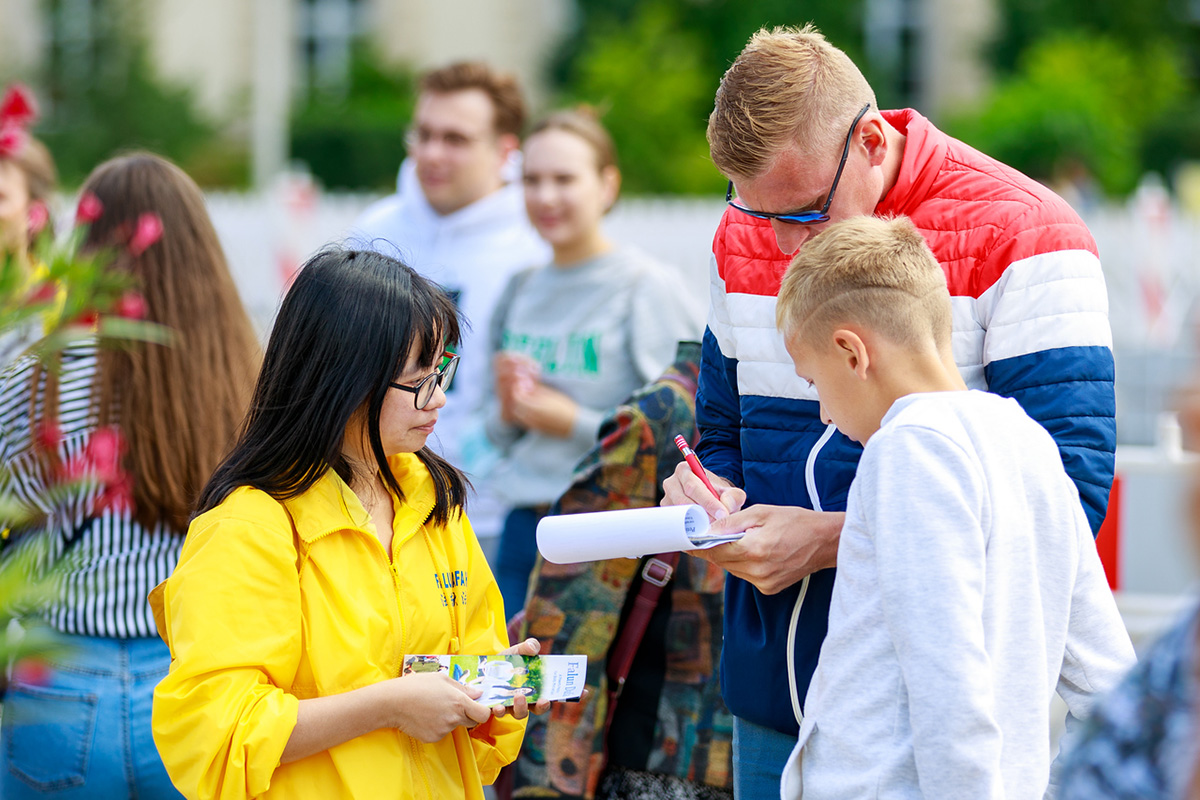 一位住在德国的华人女子带着孩子看到法轮功学员的队伍,并跟学员交谈,她说:“我知道你们,我也是有自己的信仰。”学员告诉她有信仰就不应该再相信无神论了,生命是自己的,不应该献给中共邪灵。她表示认同。之后,她同意用化名退出中共的共青团组织。