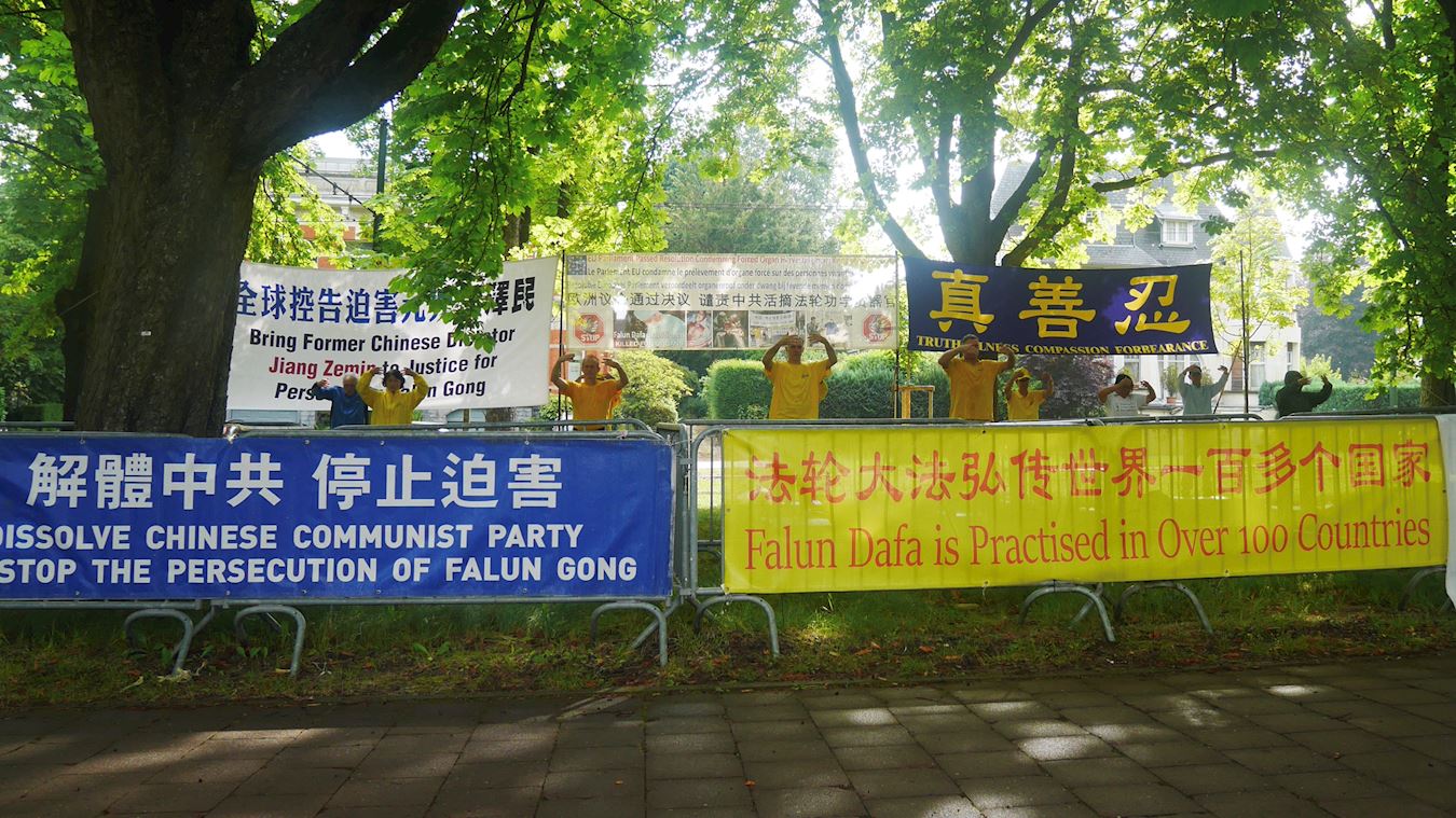 ![]() 图1~2:二零二二年七月二十日,比利时部份法轮功学员在布鲁塞尔中领馆前举办活动,抗议持续二十三年的迫害 |