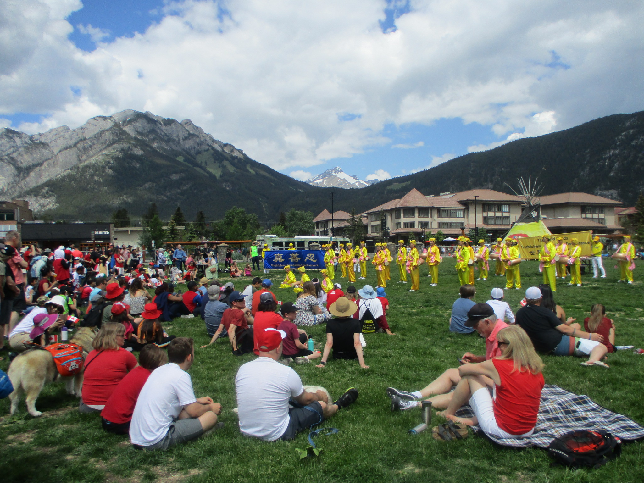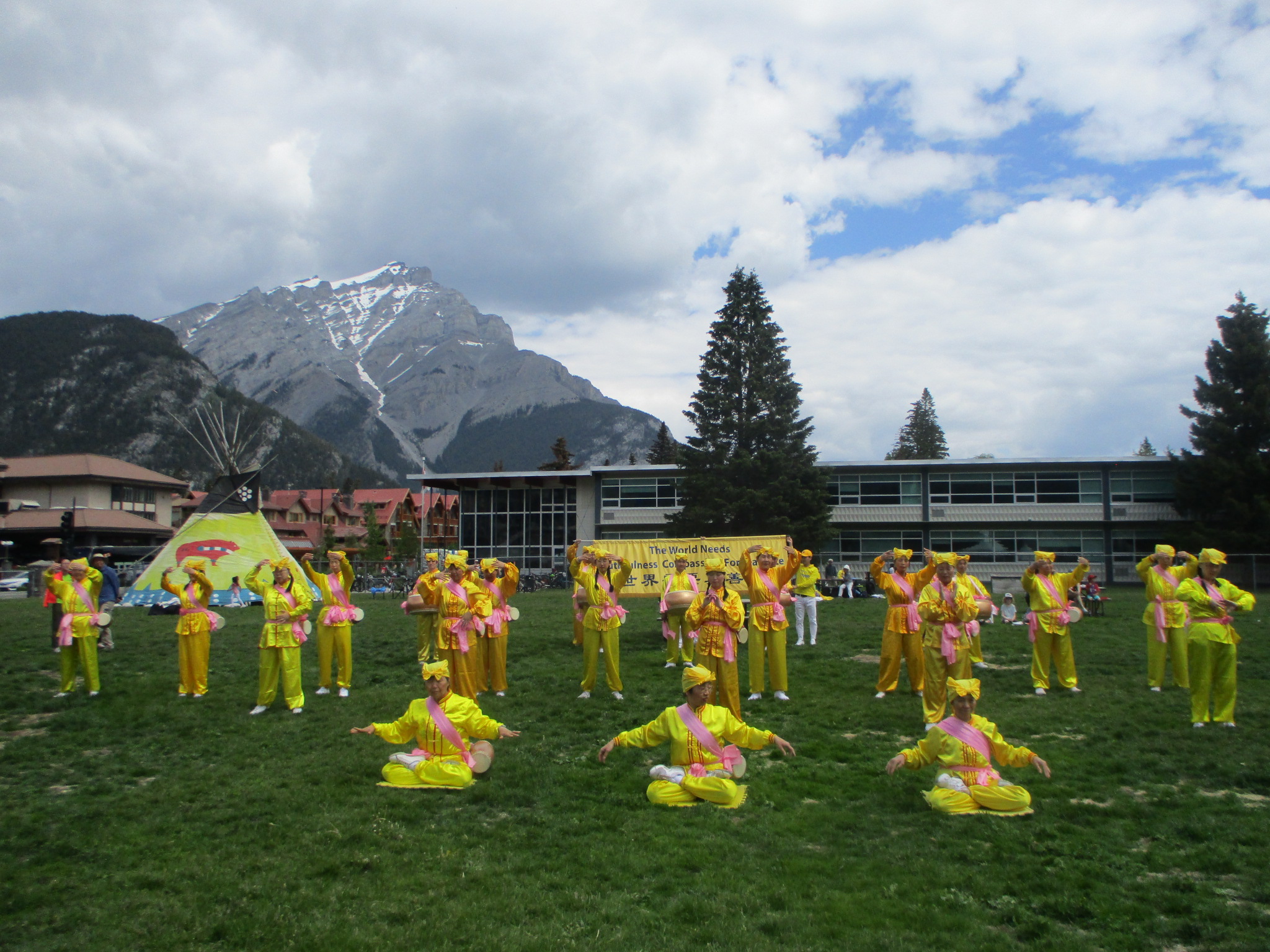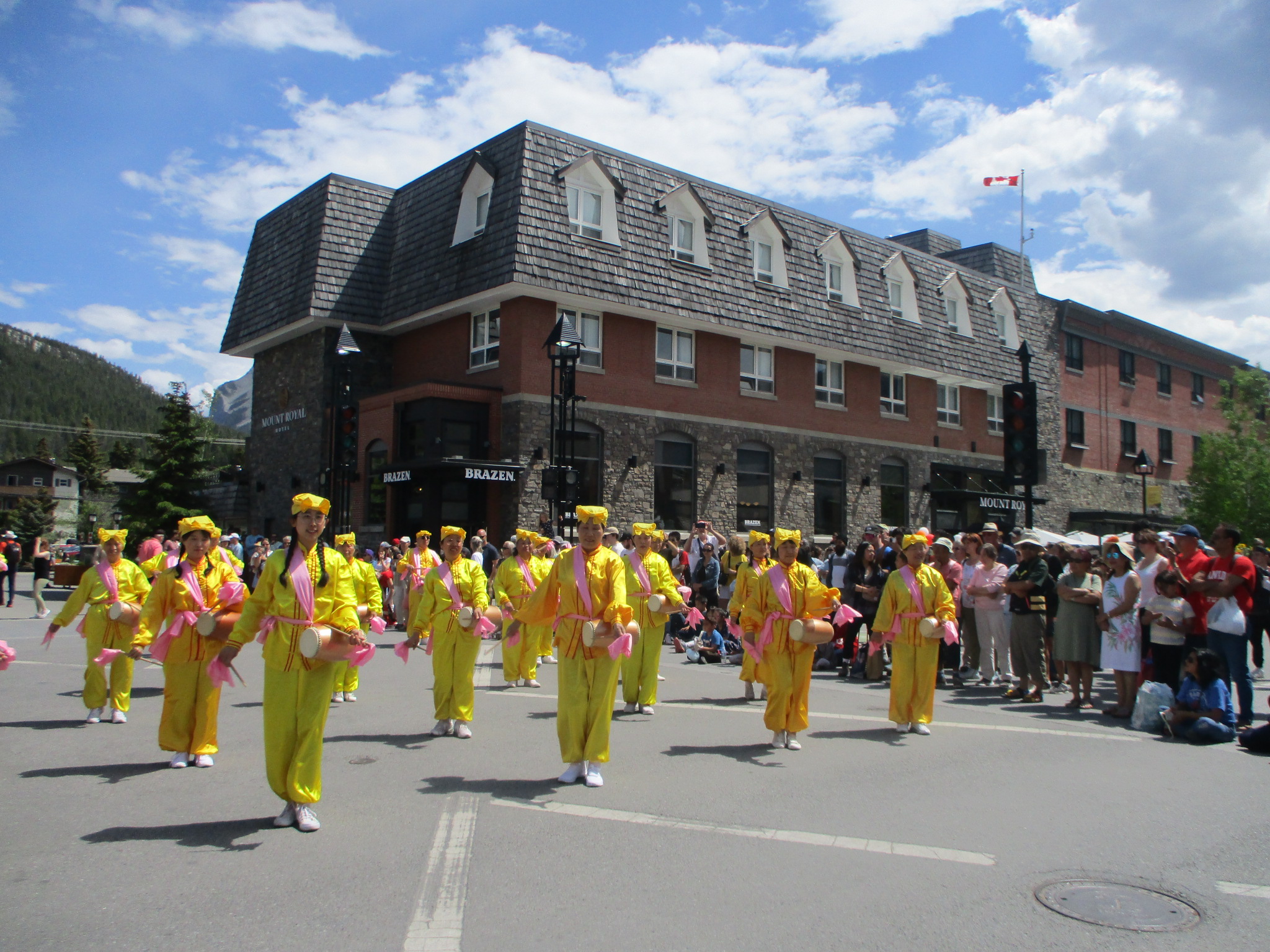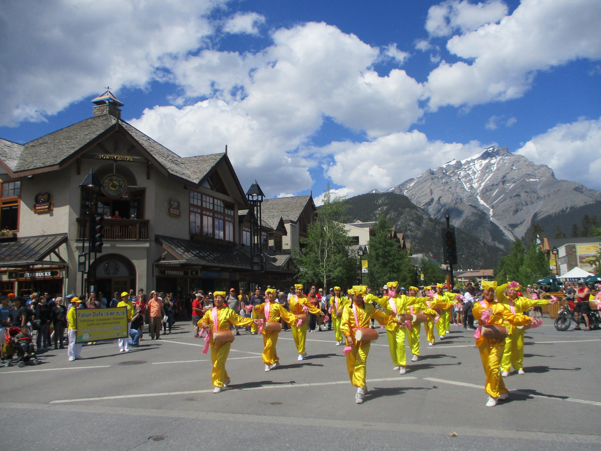 在班芙大道上,二十余人的腰鼓队整齐排列,金黄服装,嫩粉绸带,映衬着背后苍山负雪,青天浮云。在《法轮大法好》、《喜庆》、《打鼓歌》的歌声中,前进后退,左穿右插,不断变换队形,赢得观众掌声雷动。