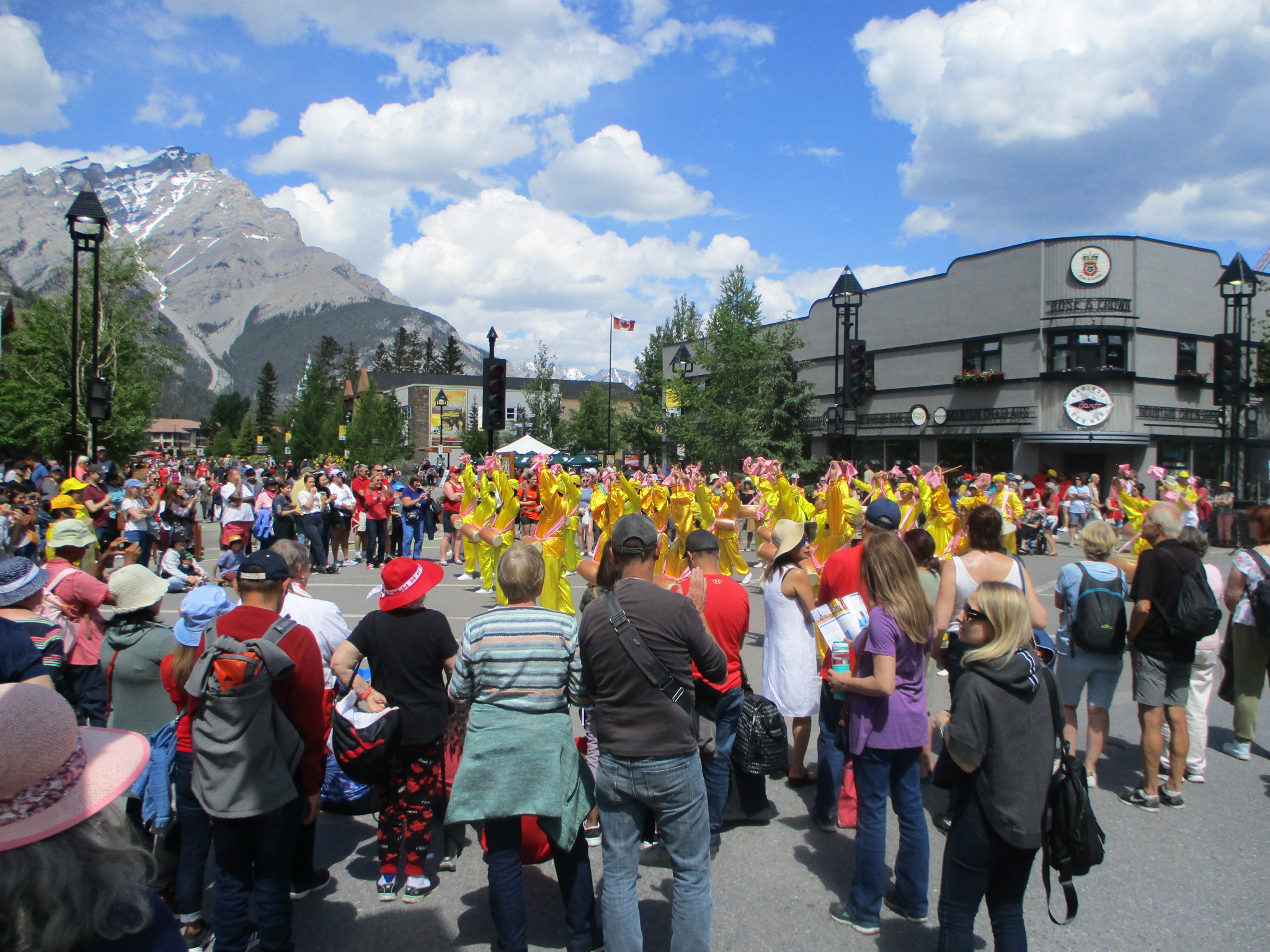 班芙镇坐落于加拿大亚省落基山脉,每年有超过四百万来自世界各地的游客。今年是疫情后首个国庆日活动,在镇中心最繁华的班芙大道上,不同国家、不同族裔、不同年龄的游客络绎不绝。卡尔加里法轮大法腰鼓队受主办方邀请,在班芙大道的两个不同地段定点表演五套功法和打腰鼓,中午和下午各一次,每次长达三十分钟。