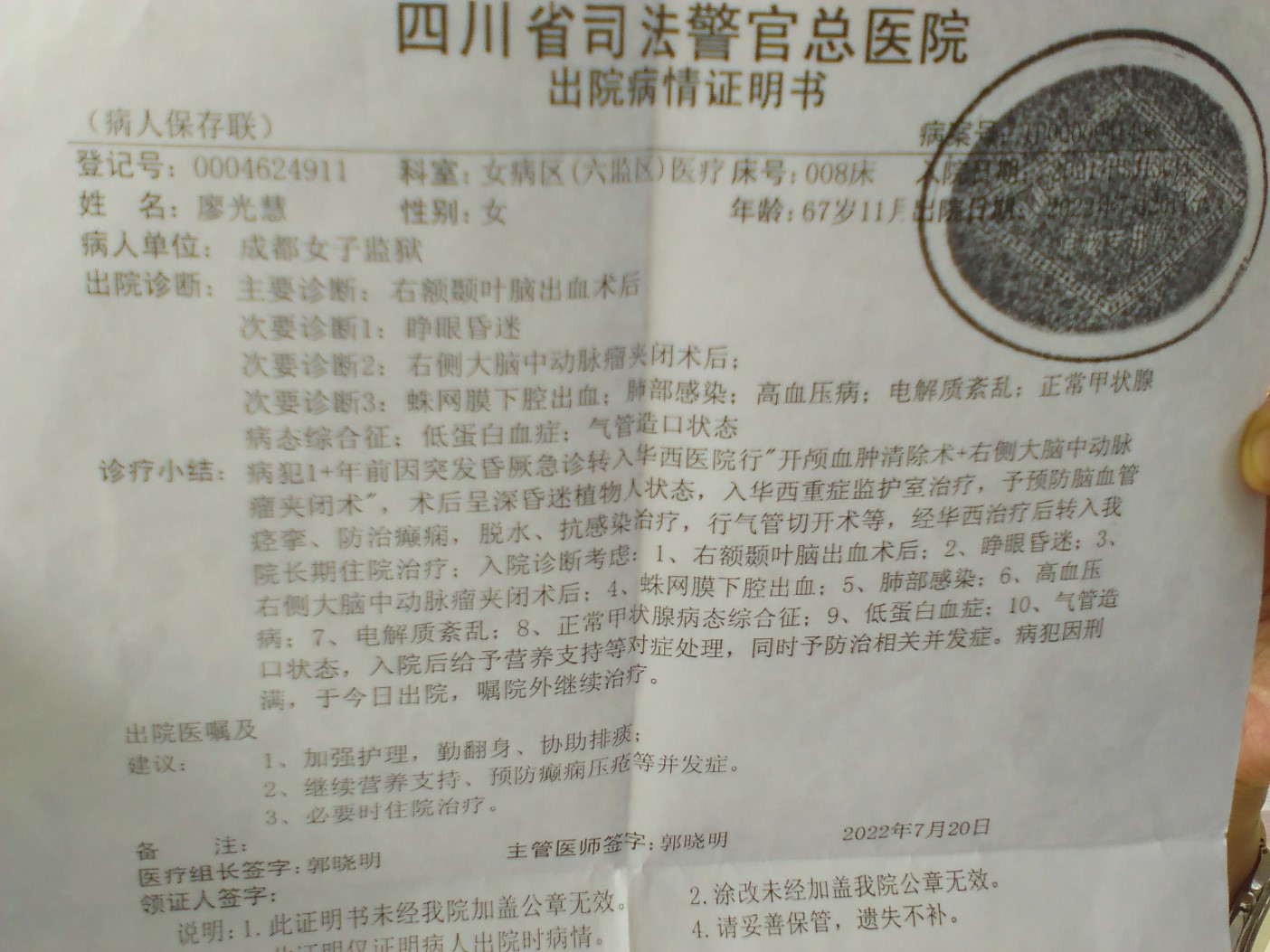 二零二二年七月二十日是廖光慧出狱的日子,绵阳市政法委去了一个人、绵阳市花园派出所住朝阳社区的警察郑涛、绵阳市朝阳社区去了一个人,加上李双全和儿子。但是,他们去了几个人都没被允许进监狱医院看廖光慧,只准她儿子一个人到医院办理出院手续上签字。监狱用救护车、还有一辆警车把廖光慧送到家后,家人才看到廖光慧被迫害的真实情况。